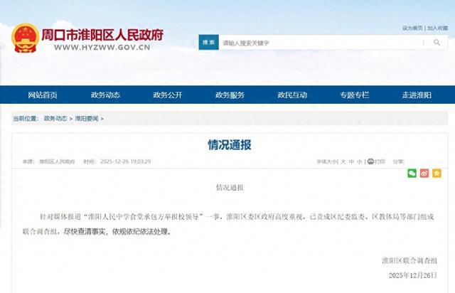 26日,河南省周口市淮阳区联合调查组发布情况通报:针对媒体报道“淮阳人民中学食堂承包方举报校领导”一事,淮阳区委区政府高度重视,已责成区纪委监委、区教体局等部门组成联合调查组,尽快查清事实,依规依纪依法处理。