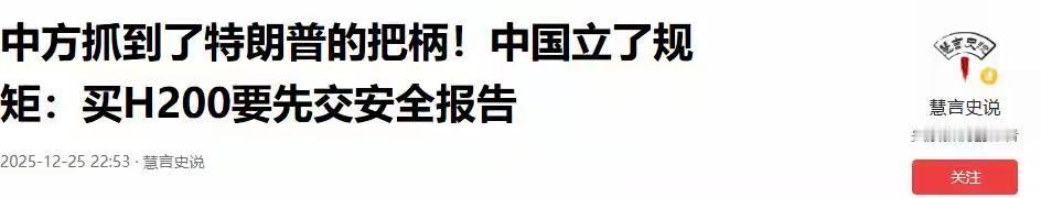 中方亮底牌,捏住特朗普命脉!买H200先交安全报告,中国规矩,谁都别想破例 这一次,中国不再忍让,直接捏住美方的七寸,立下铁规矩:想卖H200,先交安全报告,过不了中国的安全审查,休想踏进中国市场半步! 美方一边高举制裁大棒,对中国芯片产业层层围堵,一边又想捧着产品赚中国的钱,天底下哪有这样的好事?特朗普政府联手美企搞技术封锁、供应链打压,美光这类企业更是充当马前卒,一边游说美国制裁中国芯企,一边赖在中国市场捞金,甚至暗藏数据泄露、安全后门的隐患,危害我国关键基建安全。 中方此举,不是意气之争,而是正当防卫,更是主权亮剑!我们要的不是对抗,是对等的尊重,是公平的市场规则。你可以对我设限,但休想在我的地盘上,一边赚着我的钱,一边捅着我的刀。这份安全报告,是底线,是门槛,更是给所有外资企业的明确信号:中国市场大门敞开,但必须守中国规矩,保中国安全! 这不是抓到谁的把柄,这是中国挺直腰杆,拿回本该属于自己的话语权。从前我们忍气吞声,是实力未到;如今我们立规亮剑,是底气十足!国产芯片崛起,供应链自主可控,让我们再也不用看人脸色,更有底气对不合理的霸权说不。 【锐利焦点】中国的规矩,从来不是针对谁,而是护家国平安。你守规矩,我们共赢;你耍霸权,我们奉陪到底!这不是意气用事,是大国的清醒与底气,更是对所有国人的责任。美方的制裁围堵,终究堵不住中国科技的崛起,更撼不动中国守护国家安全的决心! 评论区聊聊:你觉得中国这波立规,是不是大快人心?特朗普芯片战略 H200解禁
