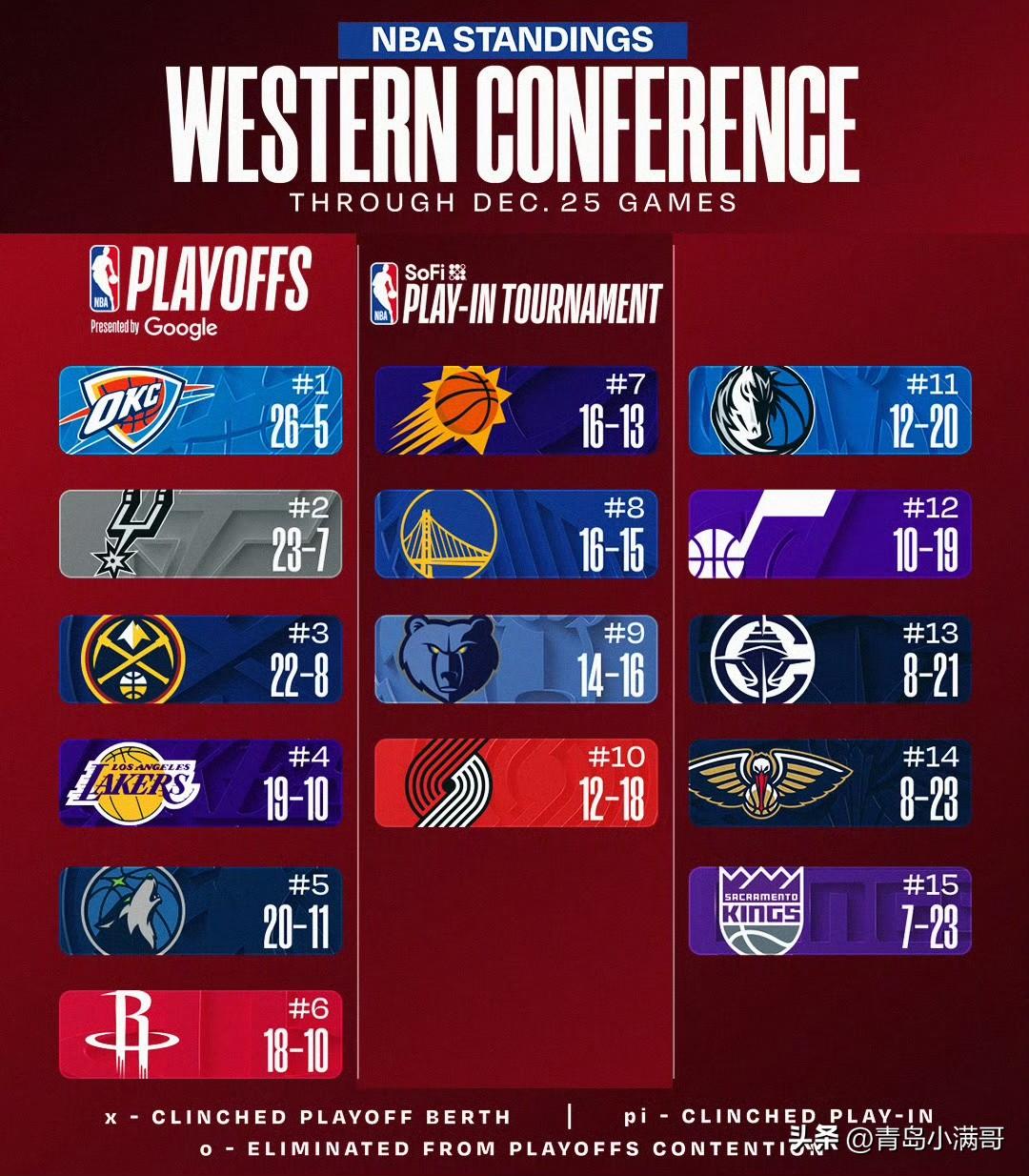 东西部最新排名!!!马刺三杀雷霆升第二,湖人不敌火箭跌至第四! 北京时间12月26日,今天是圣诞大战之夜,比赛不多却场场精彩,五场圣诞大战让球迷看了个够,一起来看下今天赛后的最新排名吧。 东部方面: 东部今天就一组圣诞大战,尼克斯对阵骑士,尼克斯稳居第二,骑士第七。 西部方面: 马刺掀翻雷霆排名第二,雷霆暂居第一,掘金胜森林狼排名第三,森林狼第五,勇士胜独行侠排名第八,独行侠第十一。 马刺在12月三次击败雷霆,让雷霆赛季失利场球来到了五场,雷霆和其他队差距越来越小,他们不再有巨大的优势了。 马刺凭借近期的赢球来到了第二,湖人和火箭则都在下降,需要加油了! 马刺 马刺队 西部nba排名 湖人 火箭 雷霆 独行侠
