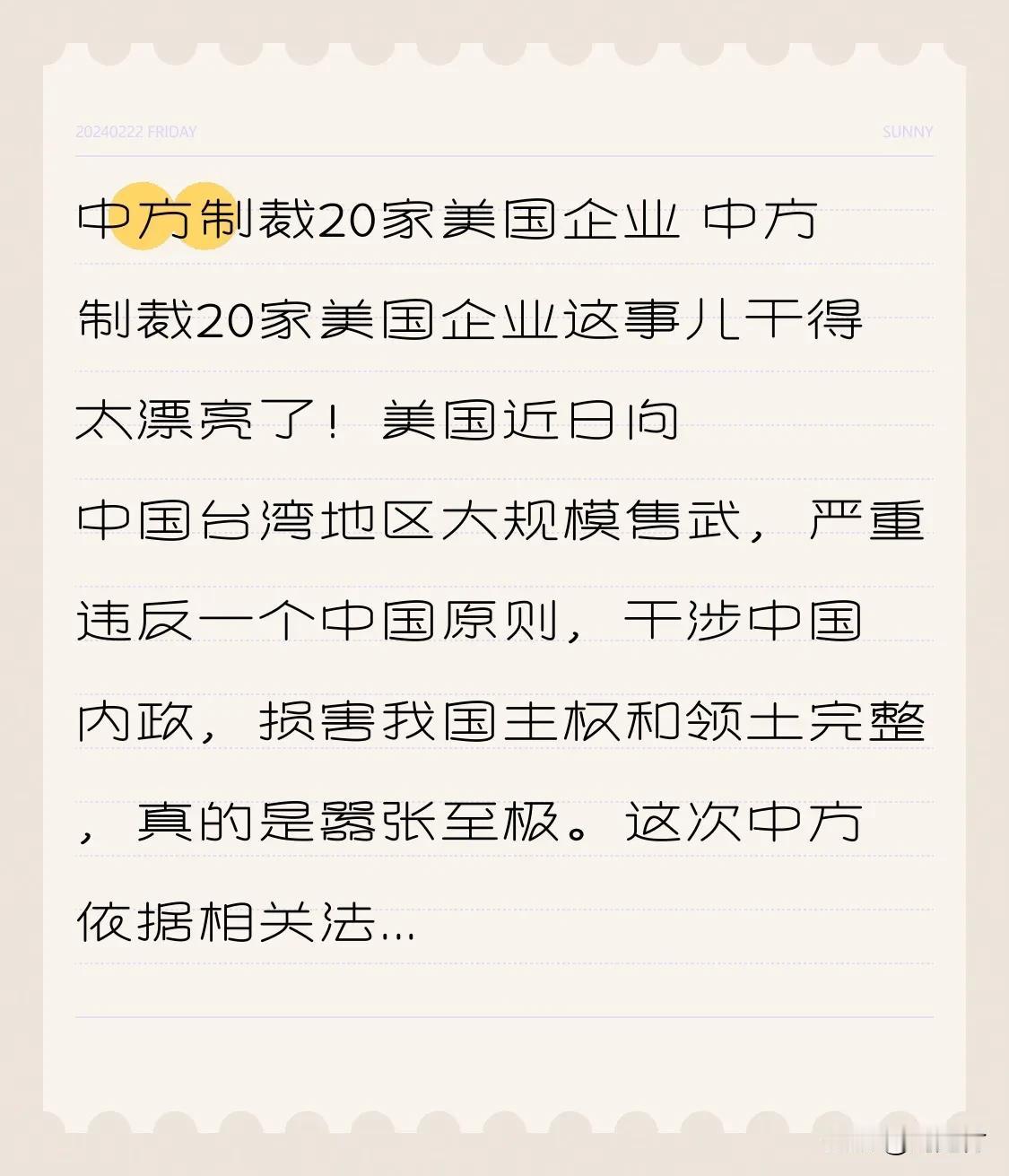 中方制裁20家美国企业 中方制裁20家美国企业,干得漂亮!近日,美国大规模向中国台湾地区售武,严重违反一个中国原则,干涉中国内政,损害我国主权和领土完整,嚣张至极。 此次,中方依据相关法律,对诺斯罗普·格鲁曼系统公司等20家企业冻结境内财产,禁止境内组织、个人与其交易合作,并对相关高级管理人员采取措施。这彰显了中国捍卫国家主权和领土完整的坚定决心。 台湾问题是中国核心利益中的核心,是不可逾越的红线。任何在台湾问题上挑衅的企业与个人都要付出代价。必须让美国明白,中国的红线碰不得! 美对华制裁 美企业制裁 对华芯片制裁