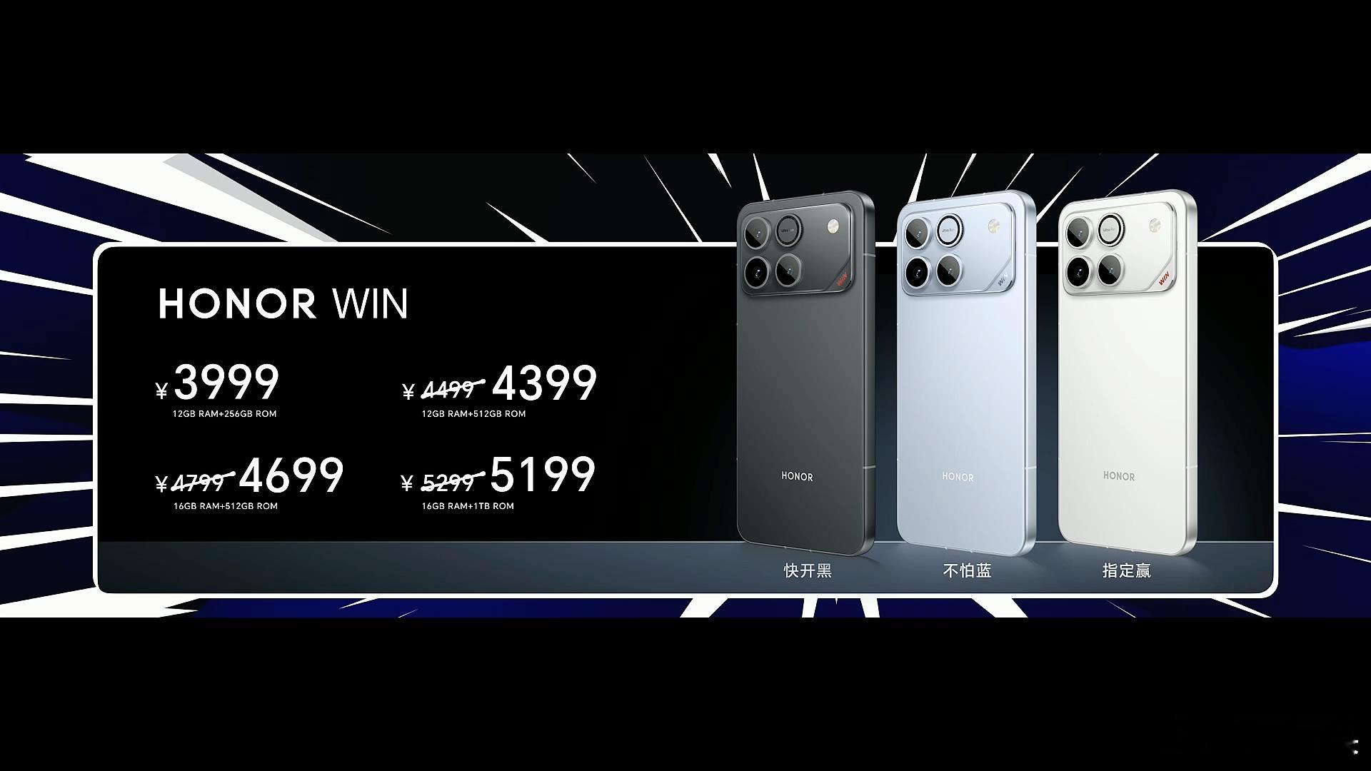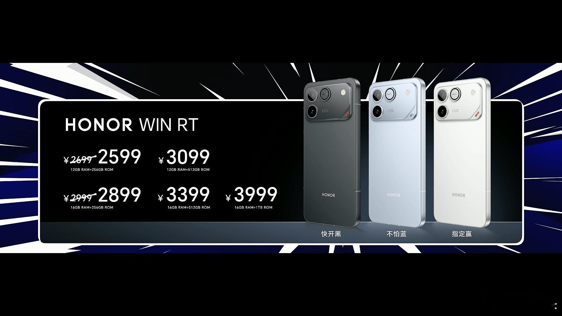 首个搭载10000mAh电池的性能手机荣耀WIN系列来了,推出了荣耀WIN和荣耀WIN RT两款机型,分别搭载骁龙8E5和骁龙8E处理器。荣耀WIN•横向大矩阵+内置风扇设计,黑白蓝三款配色,8.3mm/229g;•骁龙 8 Elite Gen5+LPDDR5X 至尊版(Ultra)+UFS4.1;•6.83 英寸 1.5K+185Hz LTPS 直屏;•10000mAh+100W 有线+80W 无线,支持 27W 反向充电;•50MP 1/1.56 英寸主摄+12MP 超广角+50MP 3X 直立长焦;•超声波指纹、双 1216 扬声器、金属中框、IP68/IP69/IP69K;•12GB+256GB 3999 元、12GB+512GB 4399 元、16GB+512GB 4699 元、16GB+1TB 5199 元。荣耀WIN RT•横向大矩阵+内置风扇设计,黑白蓝三款配色,8.3mm/225g;•骁龙 8 Elite+LPDDR5X Ultra+UFS4.1;•6.83 英寸 1.5K+185Hz LTPS 直屏;•10000mAh+100W 有线,支持 27W 反向充电;•50MP 1/1.56 英寸主摄+12MP 超广角;•超声波指纹、双 1216 扬声器、金属中框、IP68/IP69/IP69K;•12GB+256GB 2599 元、16GB+256GB 2899 元、12GB+512GB 3099 元、16GB+512GB 3399 元、16GB+1TB 3999 元。荣耀WIN