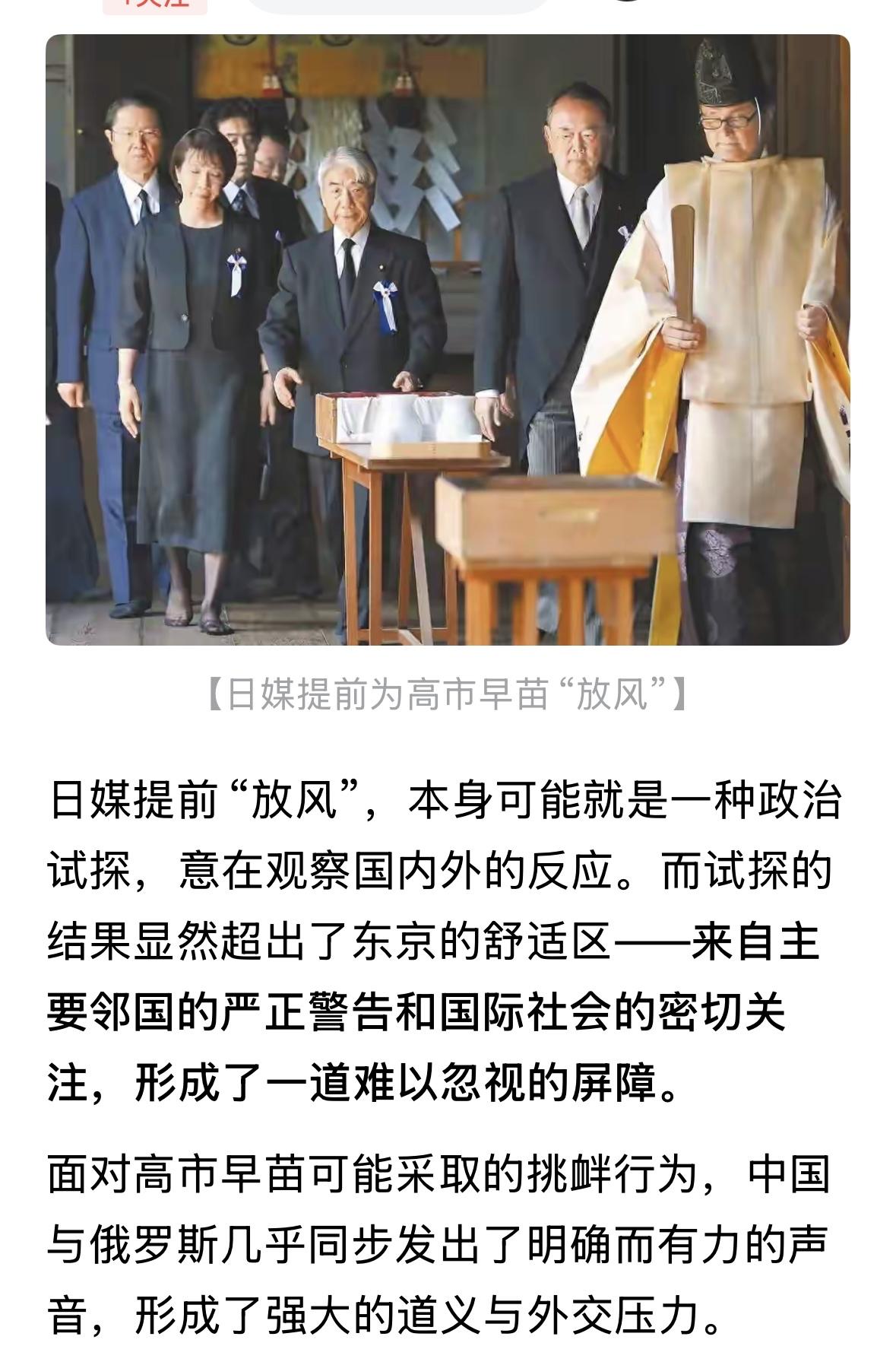 没有看到高市早苗参拜靖国神社得报道,今天也不是什么节日,防止高市早苗虚晃一枪,转