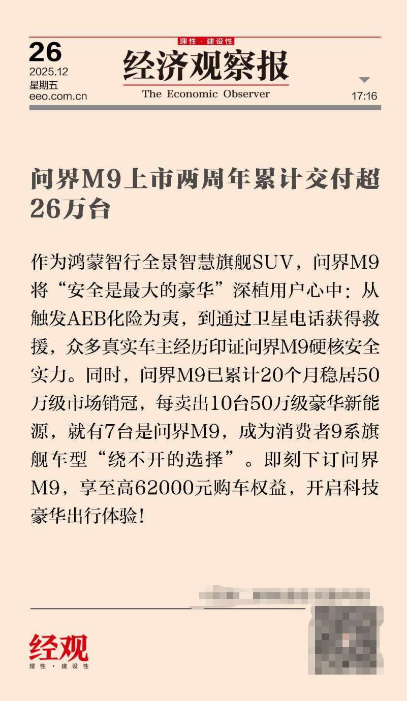 问界M9两周年:26万份信任,中国高端车破局而立 在豪华车市场激战正酣之际,问界M9以一份扎实的成绩单悄然破局:上市两周年,交付量突破26万台。没有夸张的噱头,它的成功源于对“豪华”本质的回归,高安全车身、高品质用料与高可靠性能,真正贴合高端用户对安全、舒适与耐用的核心需求。更值得关注的是,问界M9将智能科技转化为一种文化自信,让用户在体验技术领先的同时,亦感受到选择中国品牌的自豪。这不仅是产品的胜利,更是中国品牌从技术追赶到情感认同的关键跨越。它证明,在高端赛道中,中国车不必迎合旧有标准,而能自信定义属于自己的豪华。这条路虽不易,但问界M9已点亮一盏灯:高端化不在于标价,而在于值得信赖的体验。