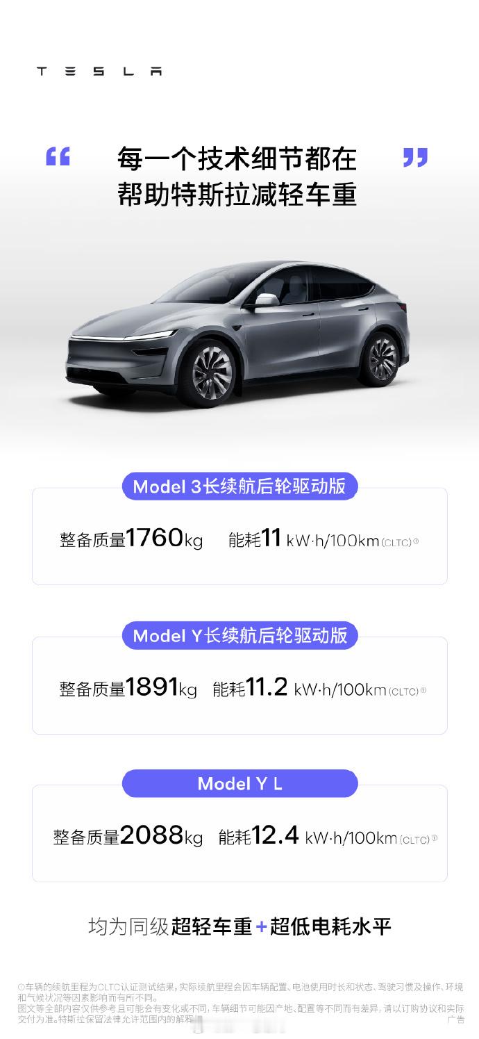 特斯拉最近专门发文,正面回应“减重=减配”的争议。特斯拉回应减重质疑 轻量化不是偷工减料,而是工程与制造能力的进步。特斯拉的减重不是删配置,而是做系统工程:低风阻流线型车身、钢铝混合结构、三合一电驱系统、一体压铸、紧凑型热泵空调、高强度全景玻璃车顶、更短更集成的整车线束——从结构、材料到集成度一起“做减法”。数据是最直接的说明:Model 3 长续航后驱 1760kg / 11kWh·h/100km;Model Y 长续航后驱 1891kg / 11.2kWh·h/100km;Model YL 2088kg / 12.4kWh·h/100km(CLTC)。在同级里同时做到更轻车重 + 更低能耗。这背后的逻辑很清楚:电动车的下一阶段竞争,不是堆电池、堆配置,而是谁能用更少的重量,跑得更远、更稳、更高效。新能源汽车特斯拉