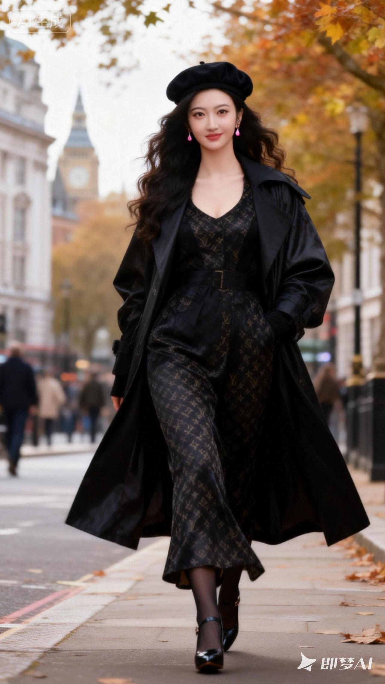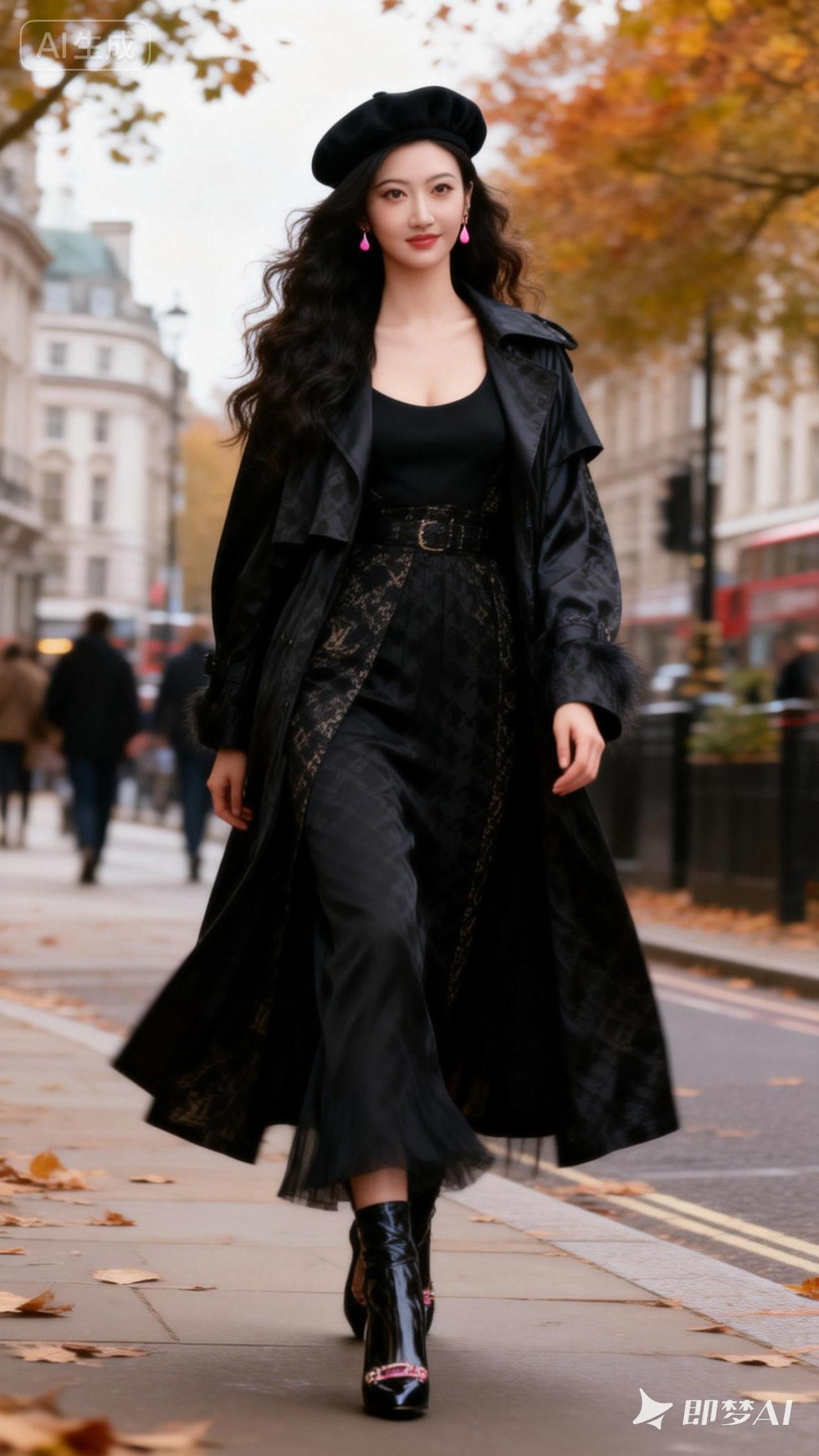 都市时尚风,黑色风衣搭配贝雷帽,走在秋日街头,尽显优雅与自信。