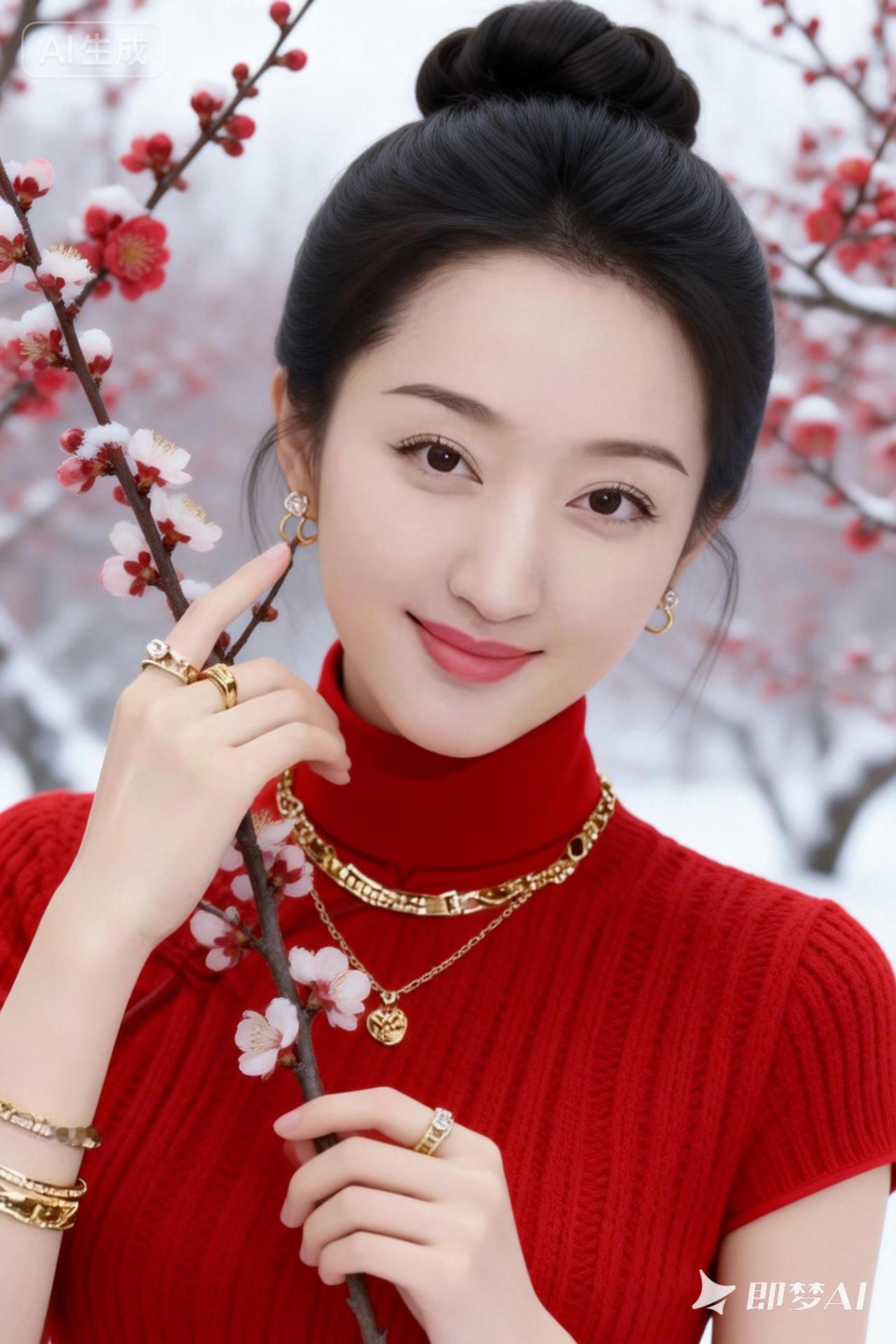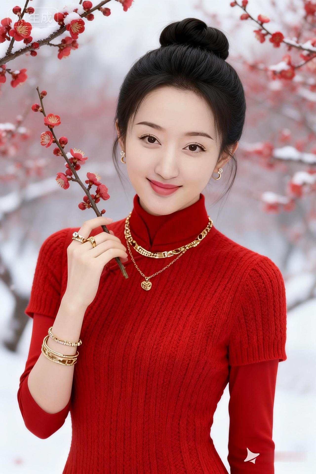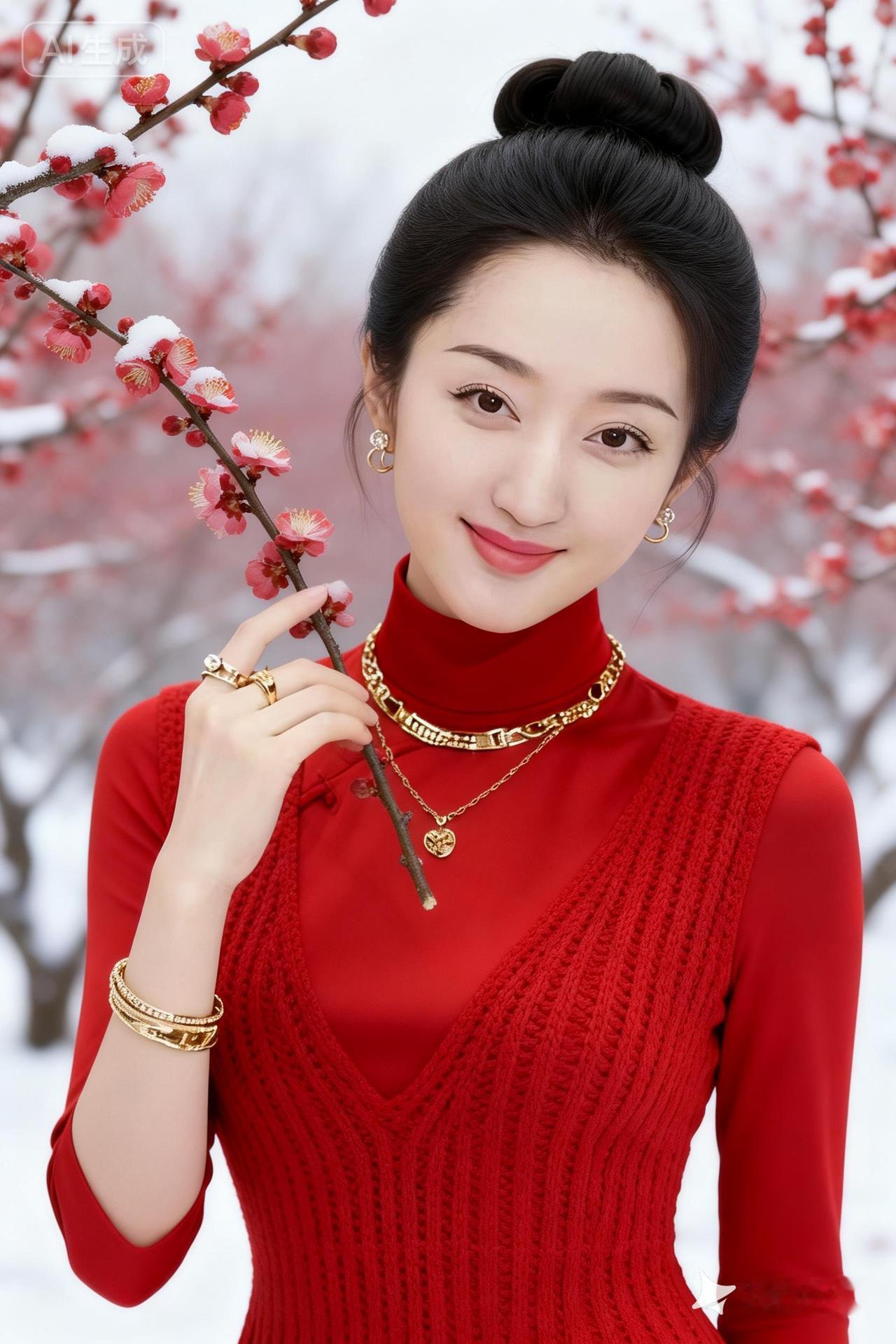 冬日暖阳下,红衣少女与雪中梅花相映成趣。