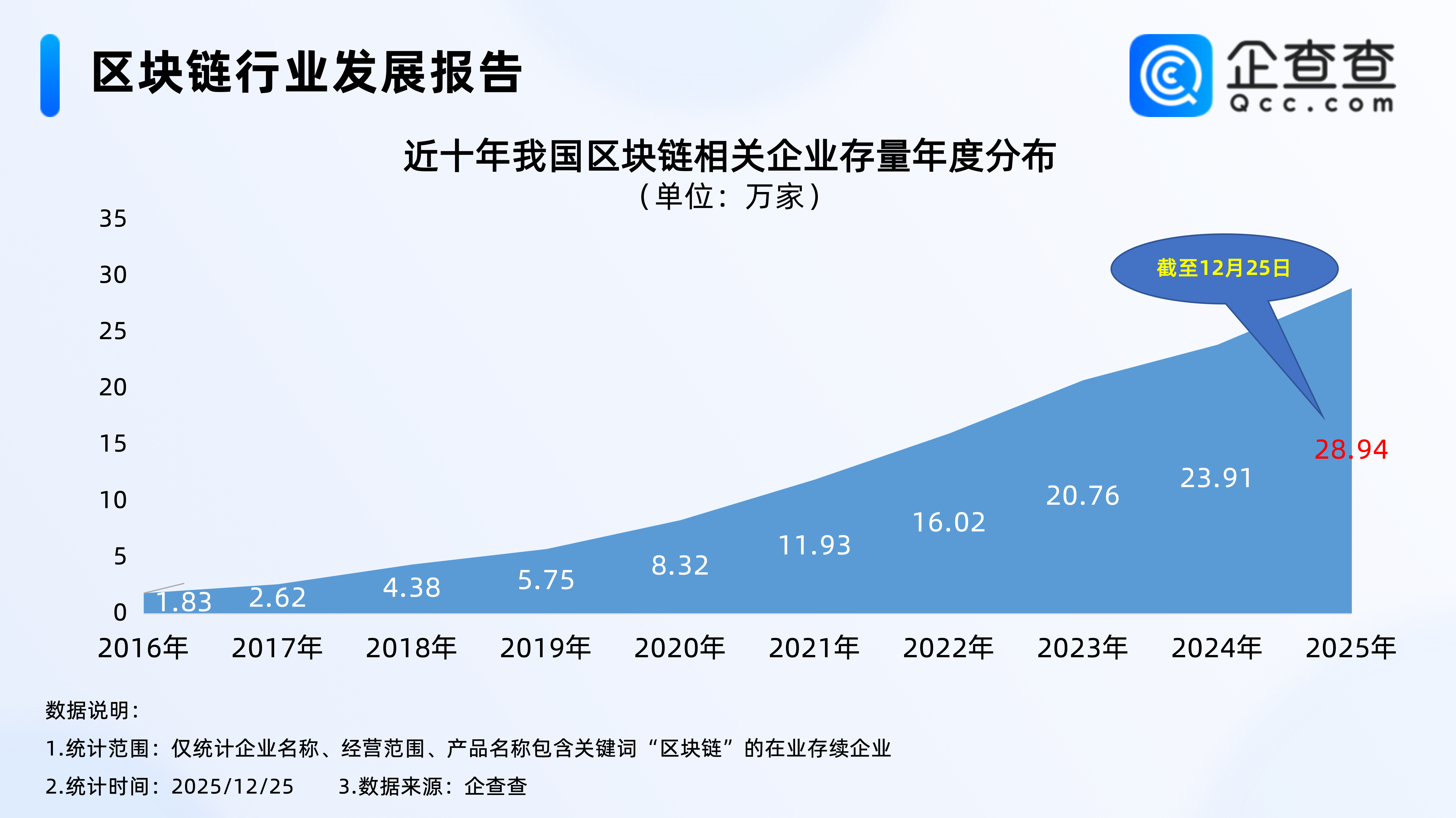 企查查数据显示,2019年开始,我国区块链相关企业存量增速加快,并于2023年首次突破20万家,达20.76万家;截至12月25日,我国现存28.94万家区块链相关企业。