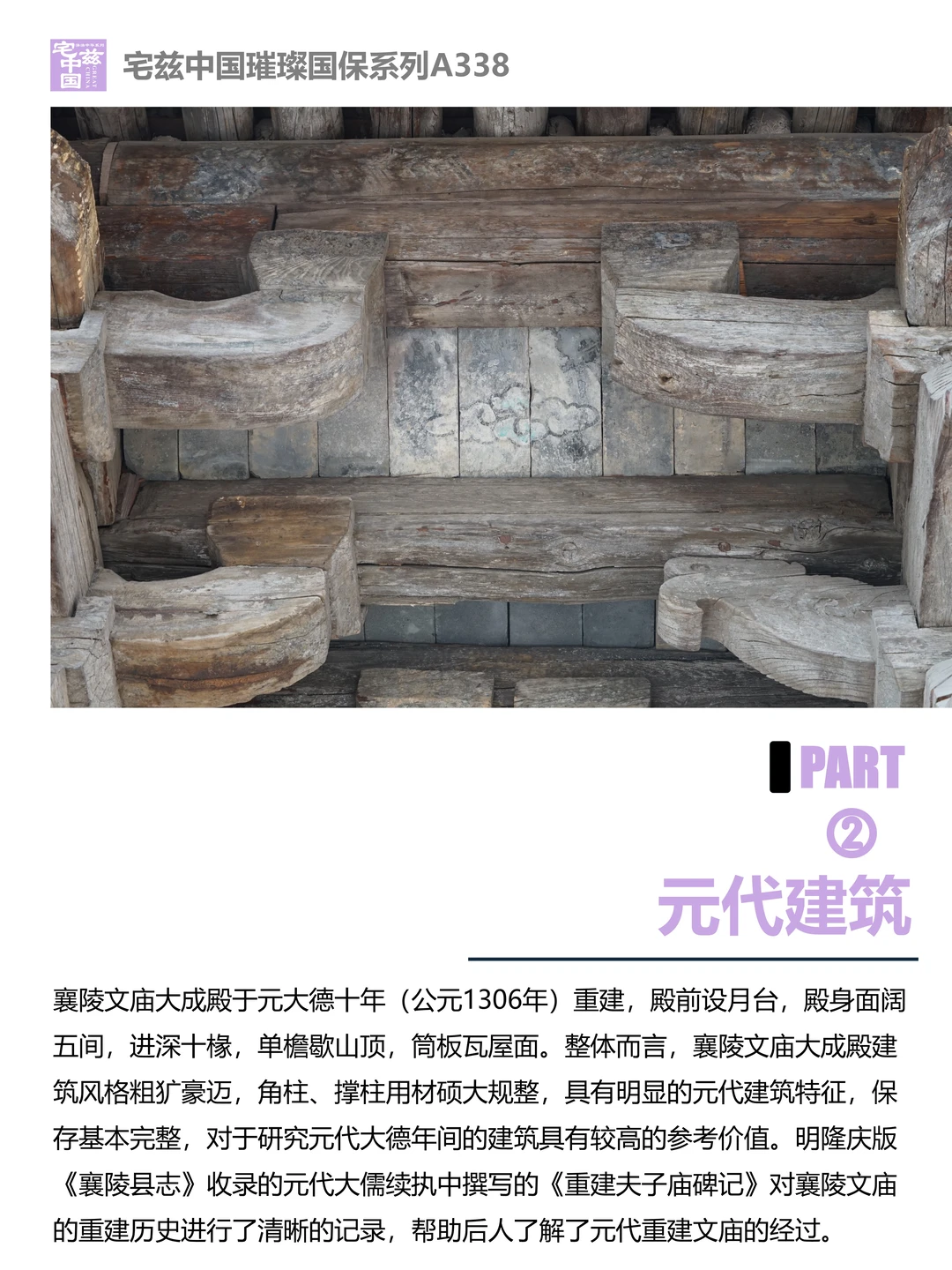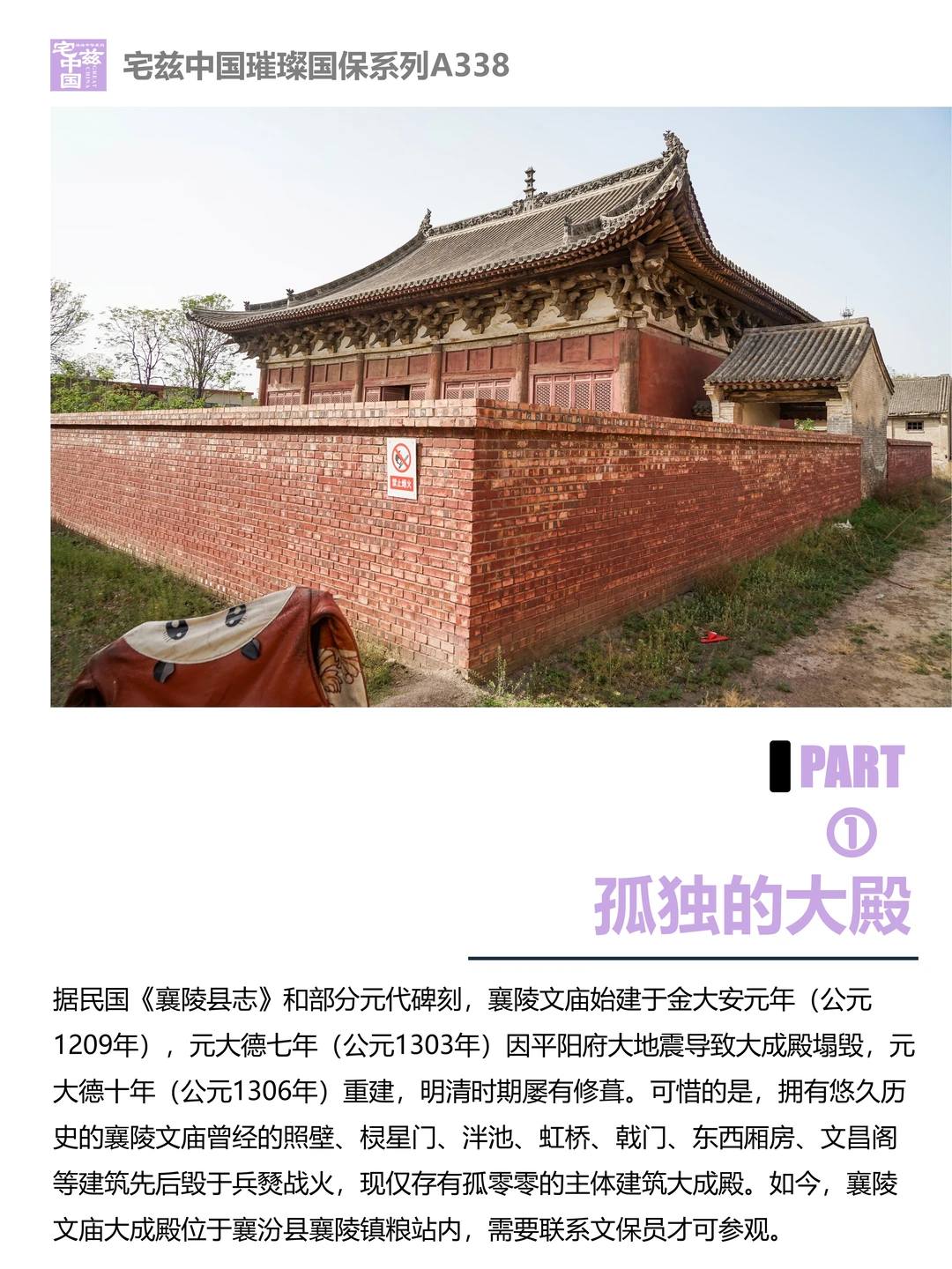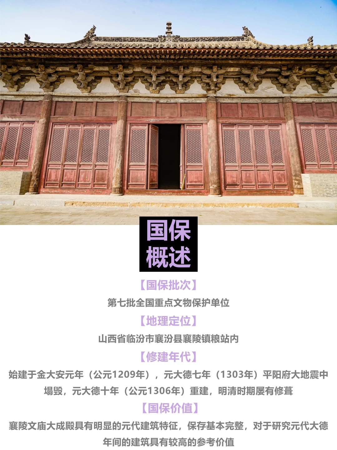 襄陵文庙始建于金大安元年(公元1209年),元大德七年(公元1303年)因地震塌毁。元成宗时期,皇帝推崇儒教,在这一契机下,襄陵文庙得以在元大德十年(公元1306年)重建,可惜文庙如今只留存下了大成殿。襄陵文庙大成殿殿身面阔五间,进深十椽,单檐歇山顶,筒板瓦屋面,整个建筑风格粗犷豪迈,角柱、撑柱用材硕大规整,具有明显元代建筑特征,是山西12座元代文庙建筑之一,保存基本完整,对研究元大德年间建筑具有较高的价值。全国重点文物保护单位 古代建筑美 古代建筑艺术 古建筑文化 襄陵文庙 襄陵文庙大成殿 襄陵 文庙