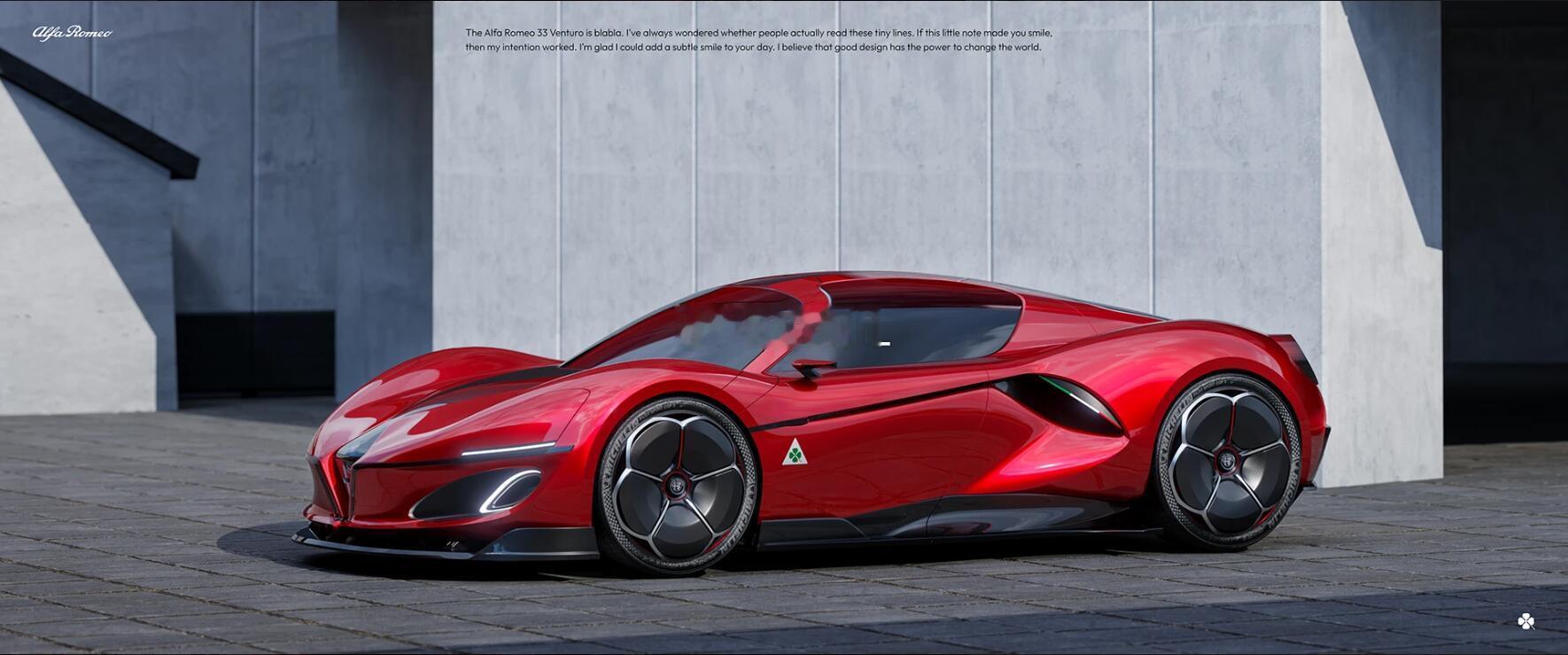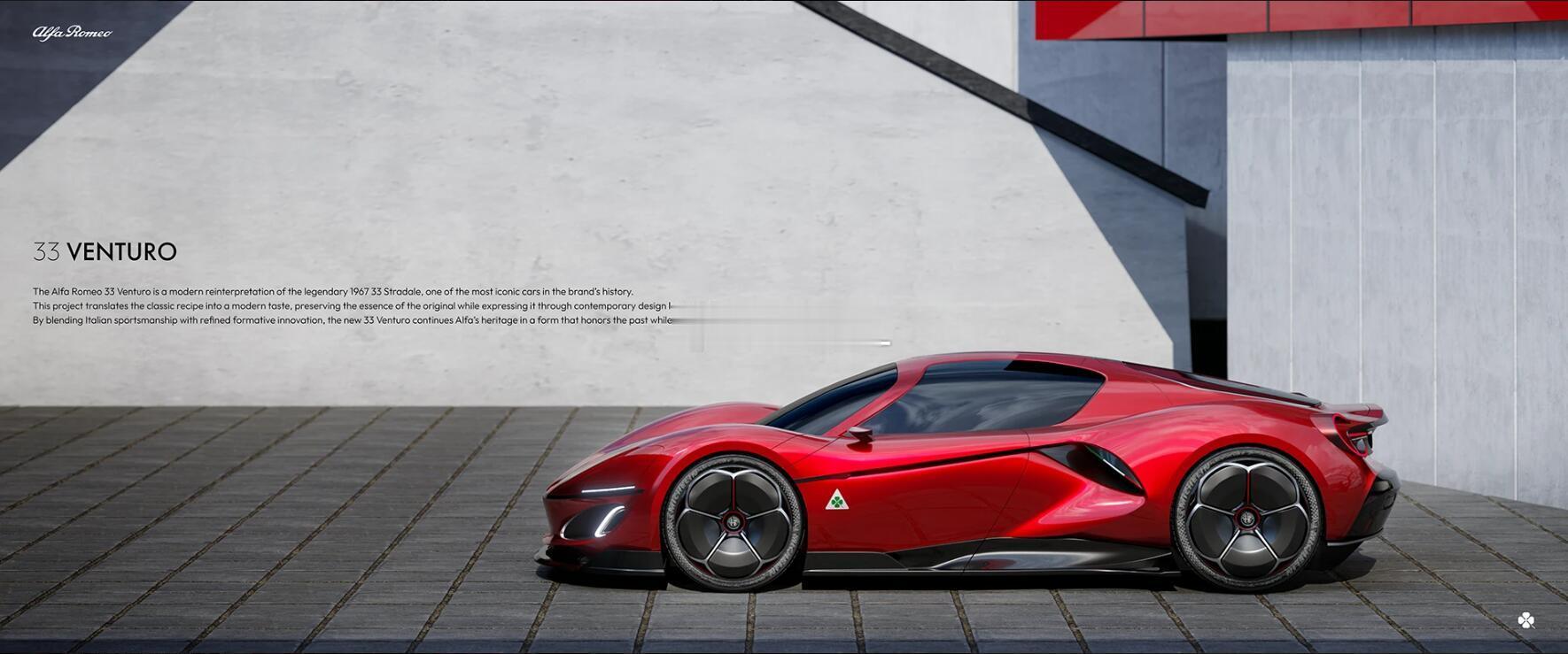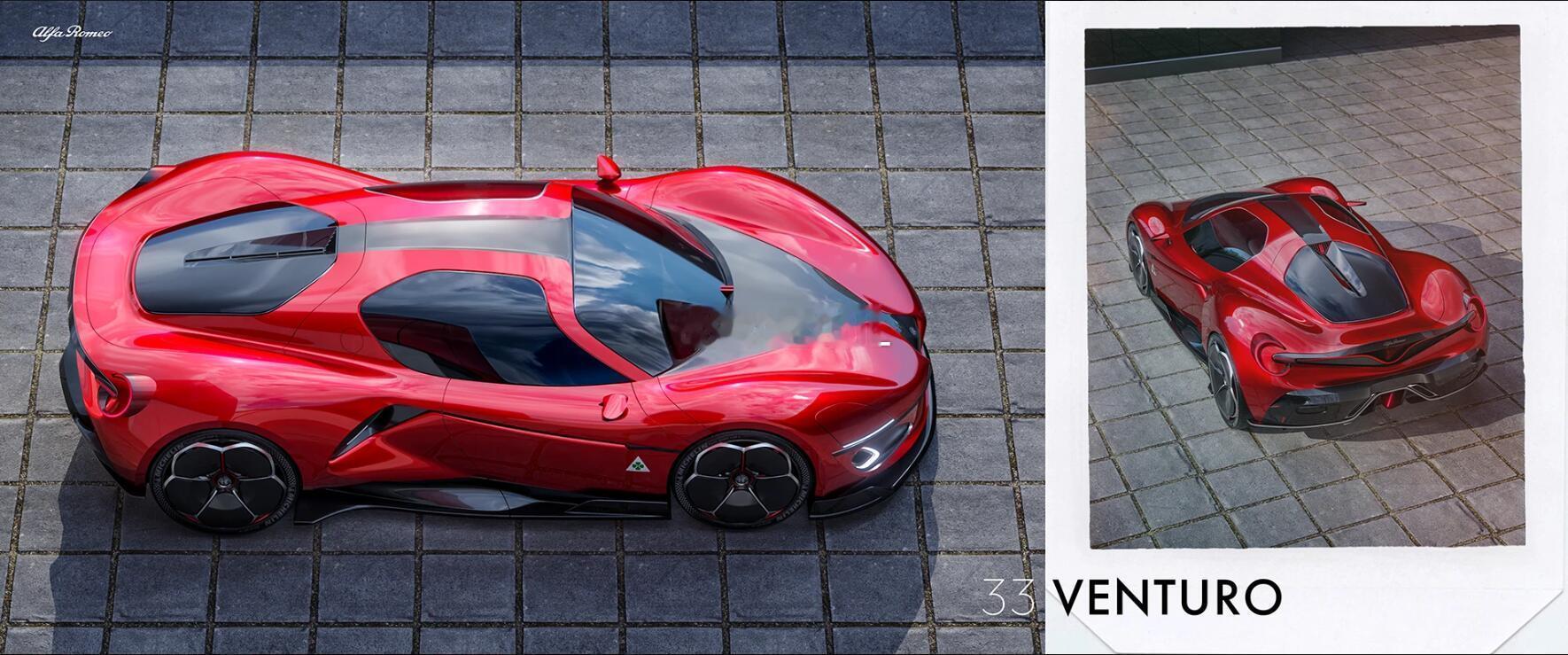 Alfa Romeo 33 Venturo阿尔法·罗密欧33 Venturo是传奇的1967年33 stradale的现代诠释,后者是该品牌历史上最具标志性的车型之一。该项目将经典配方转化为现代风味,保留原味精髓的同时通过当代设计语言加以表达。通过融合意大利体育精神与精致的造型创新,新款33 Venturo延续了阿尔法的传承,以一种尊重过去、同时面向未来的姿态呈现。阿尔法罗密欧