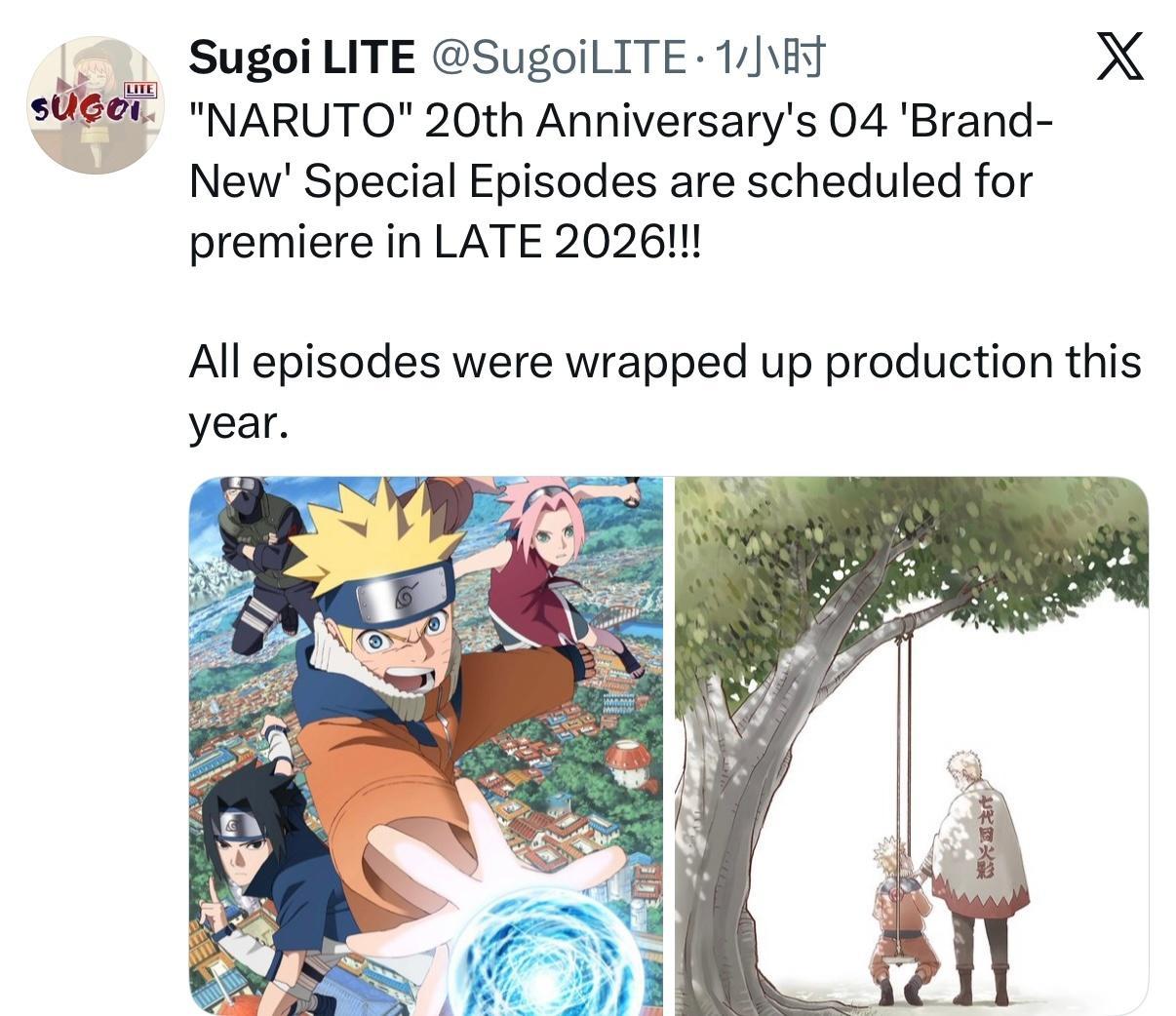 据情报师(SugoiLITE)发文透露:《火影忍者》20周年纪念完全新作动画(全四集)预计将于2026年年底首播!今年所有剧集的制作都已完成火影忍者