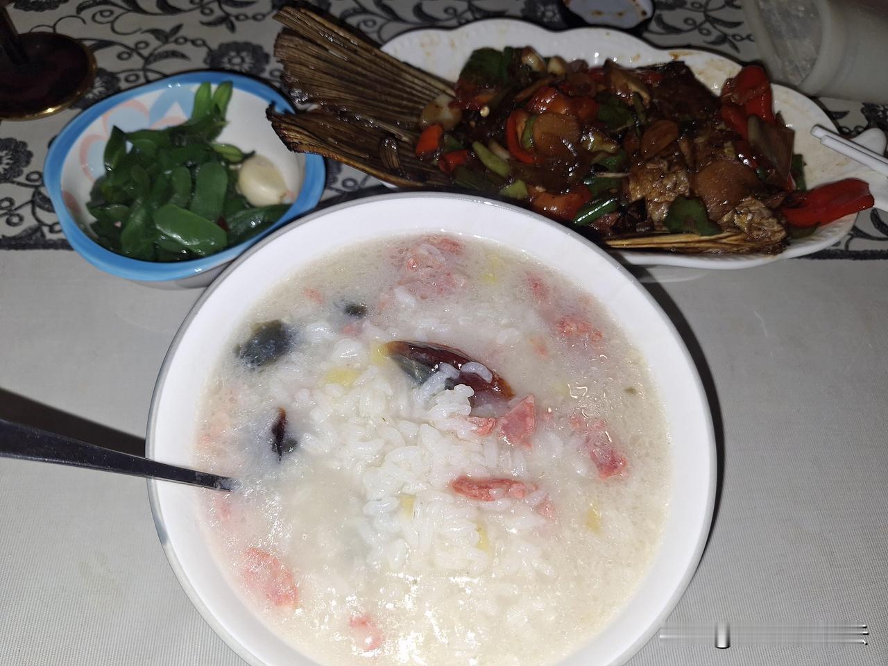 又下雪了,年终岁尾,做条鱼尾巴吃,尽显鲁菜精粹——黑乎乎、油乎乎、咸乎乎。皮蛋瘦肉粥不用瘦肉,代之以广式腊肠,口感更好。