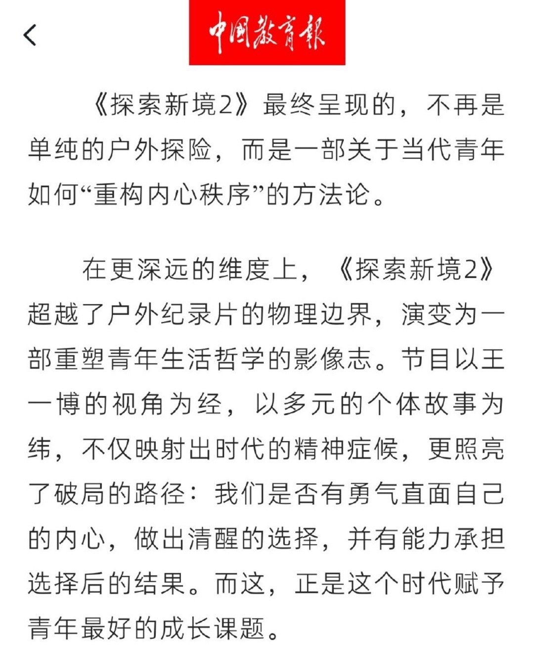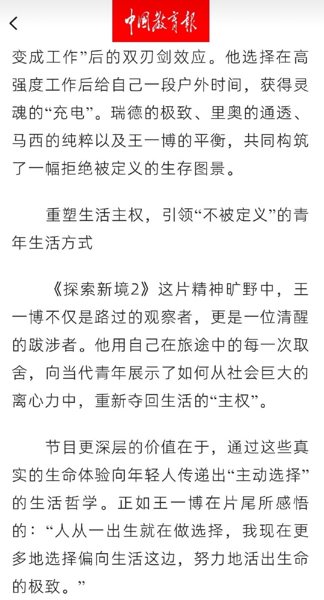 中国教育报发文:王一博探索新境2引领不被定义的青年哲学。1.探索新境2最终呈现的不是单纯的户外探险,而是一部关于当代青年如何“重构内心新秩序”的方法论。2.探索新境2这片精神旷野中,王一博不仅是路过的观察者,更是一位清醒的跋涉者。3.王一博用自己在旅途中的每一次取舍,向当代年轻人展示了如何从社会巨大的离心力中,重新夺回生活的主权。王一博中国当代青年优秀代表的意义具象化了。