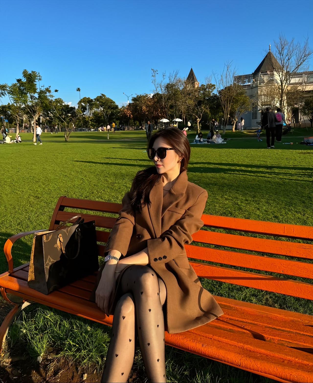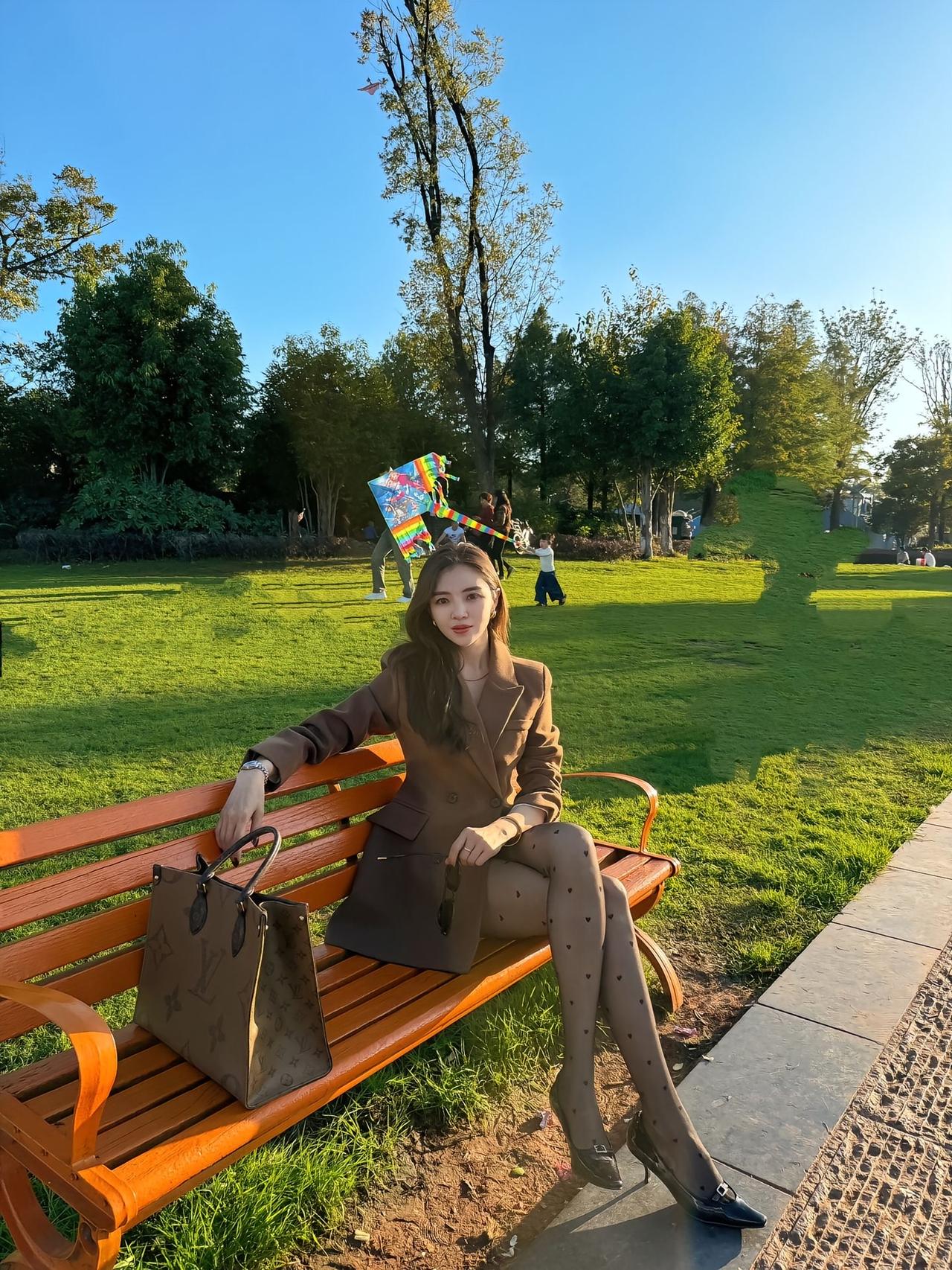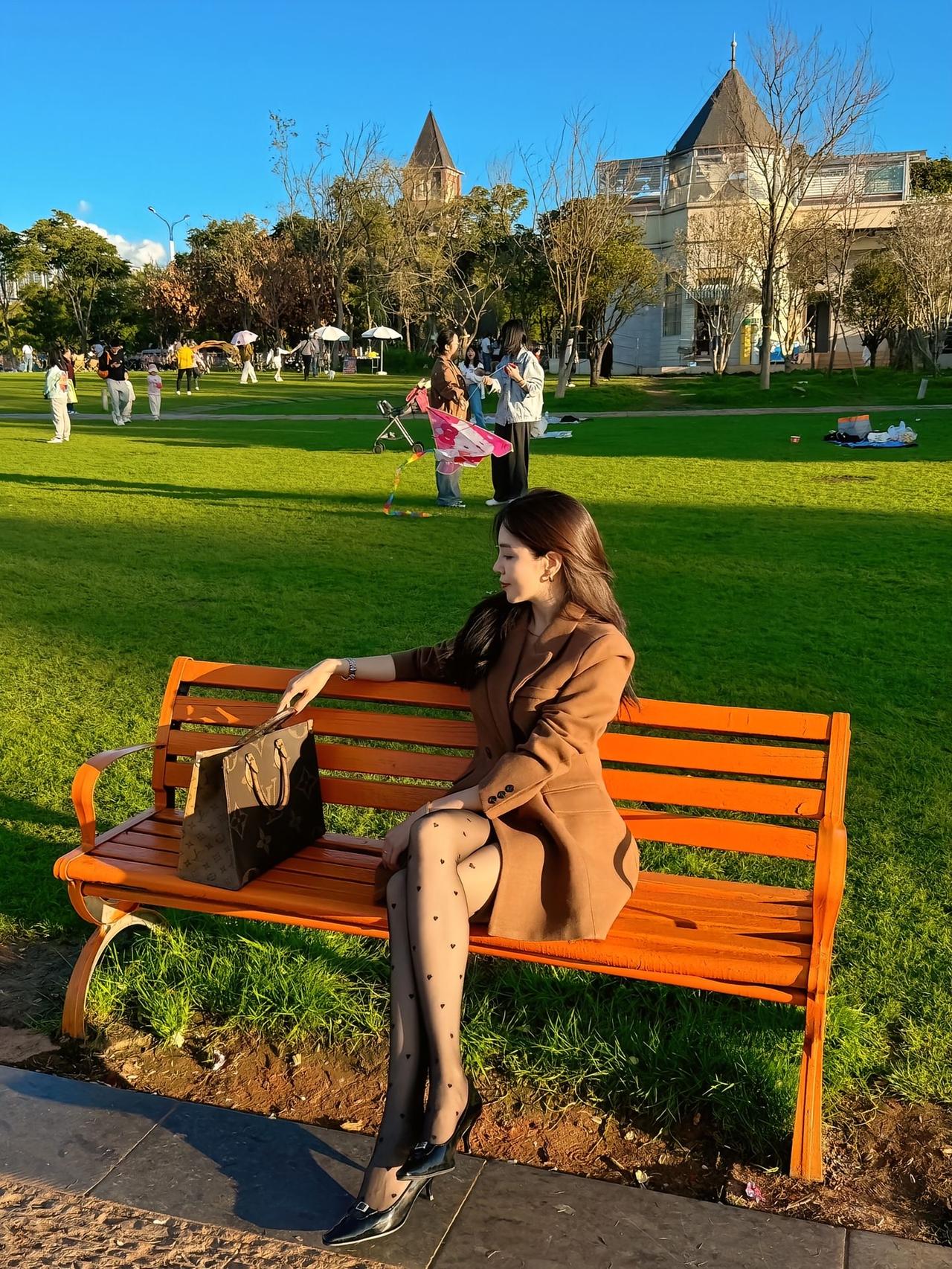 冬日公园漫步,时尚穿搭与自然美景的完美融合。