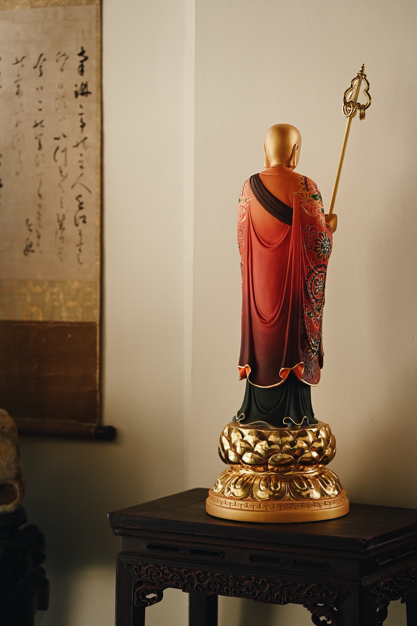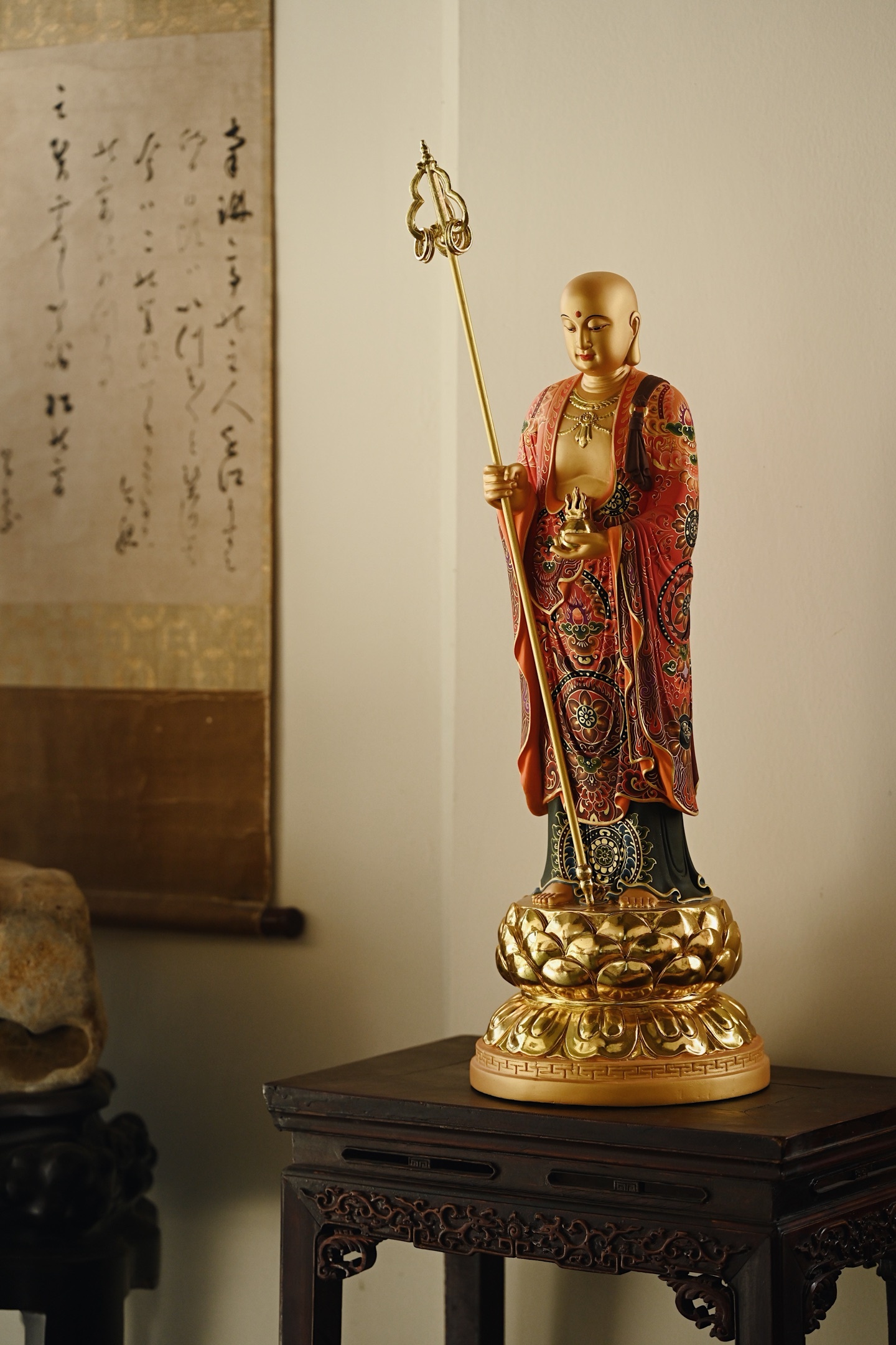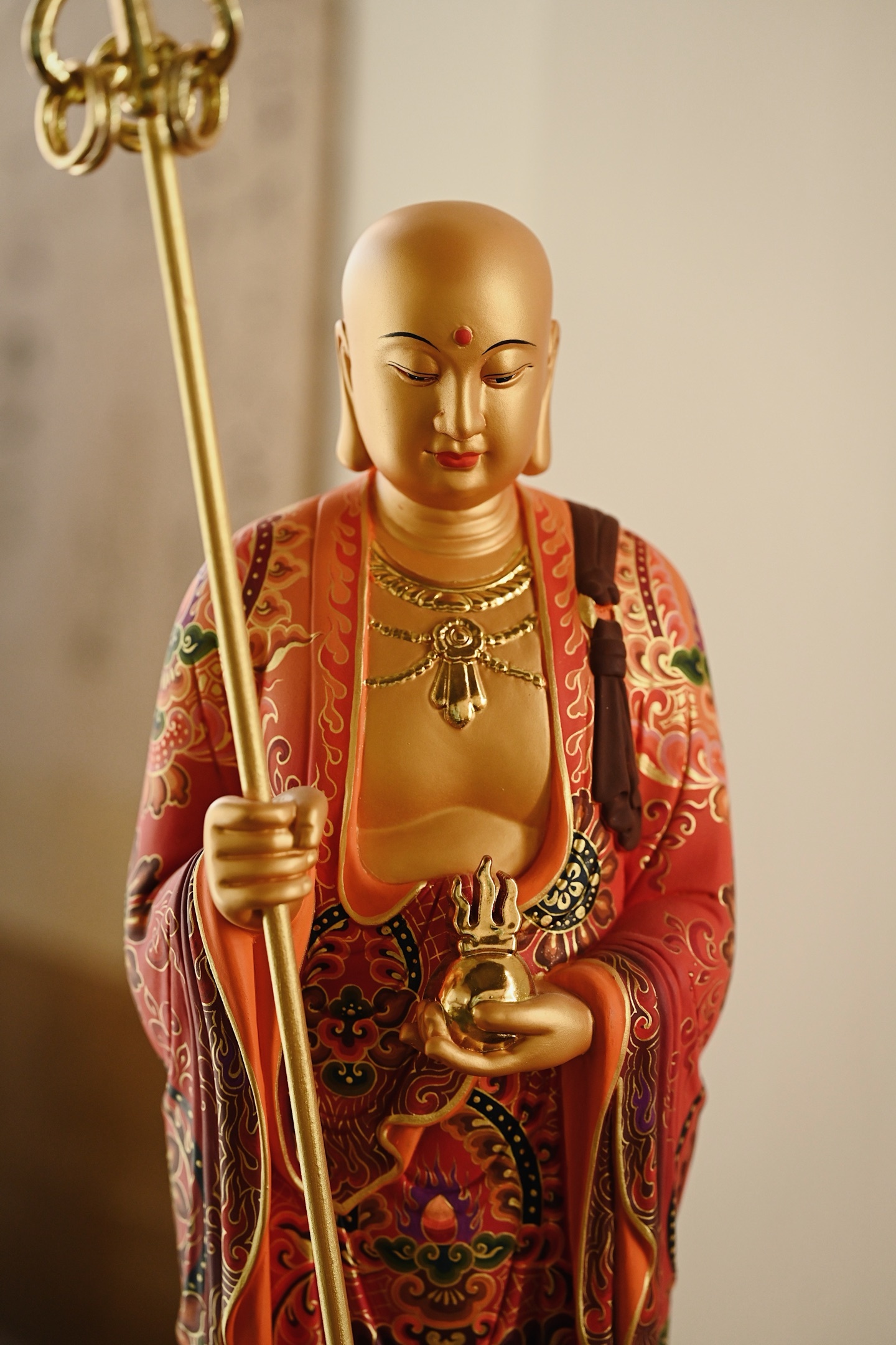 香樟木×彩绘×鎏金 | 地藏王地藏菩萨双目微垂、神态安详,身着僧袍,周身描金银,