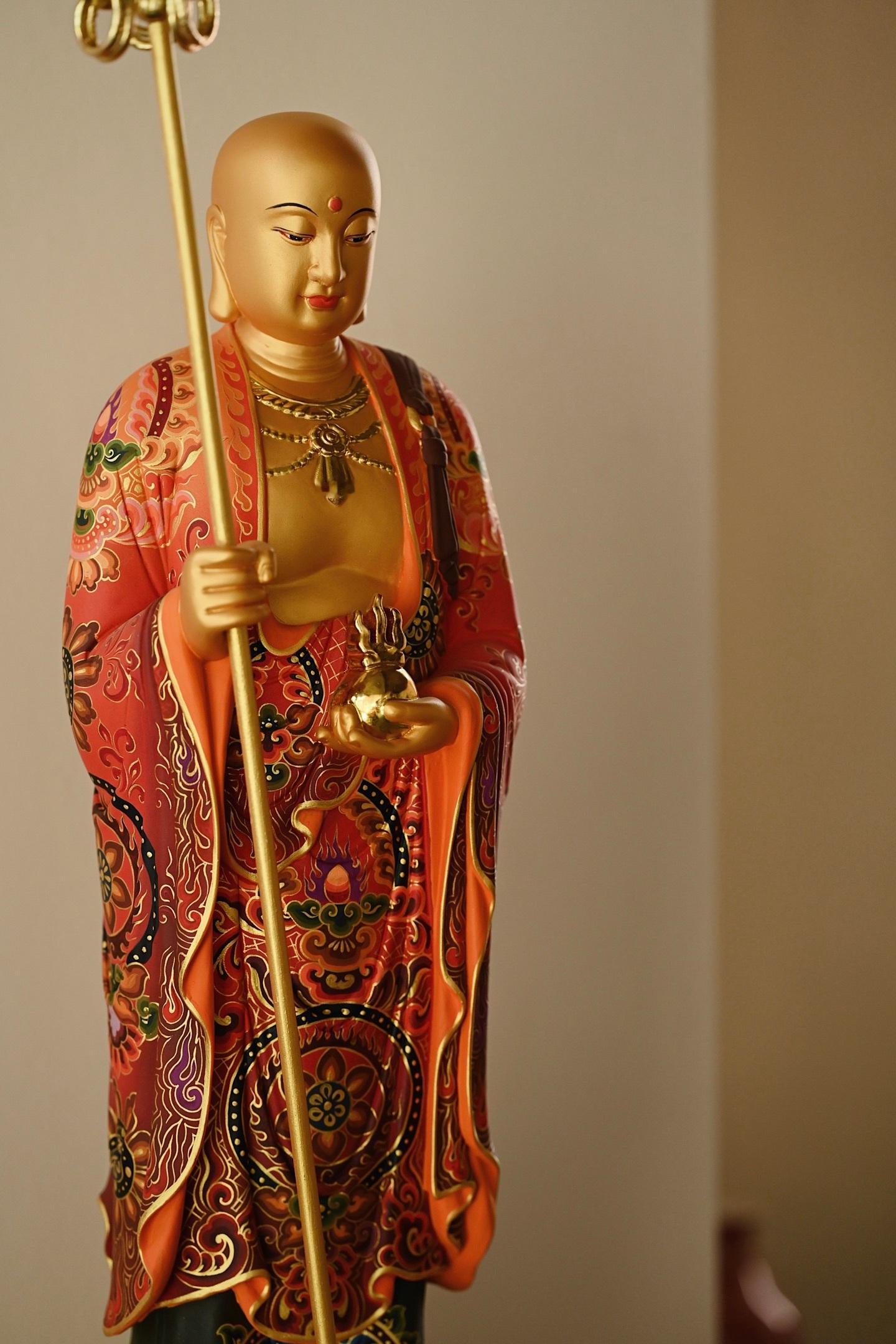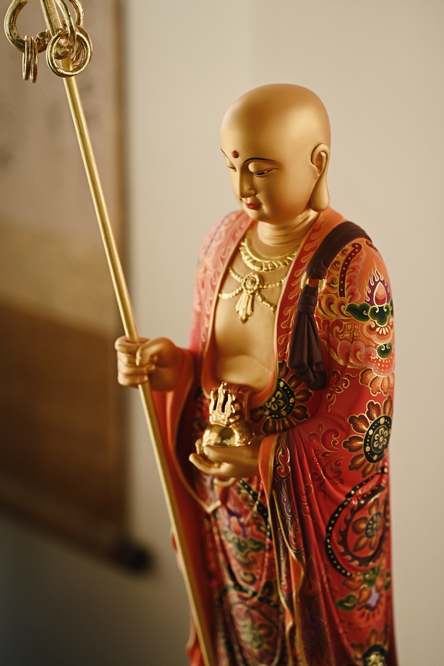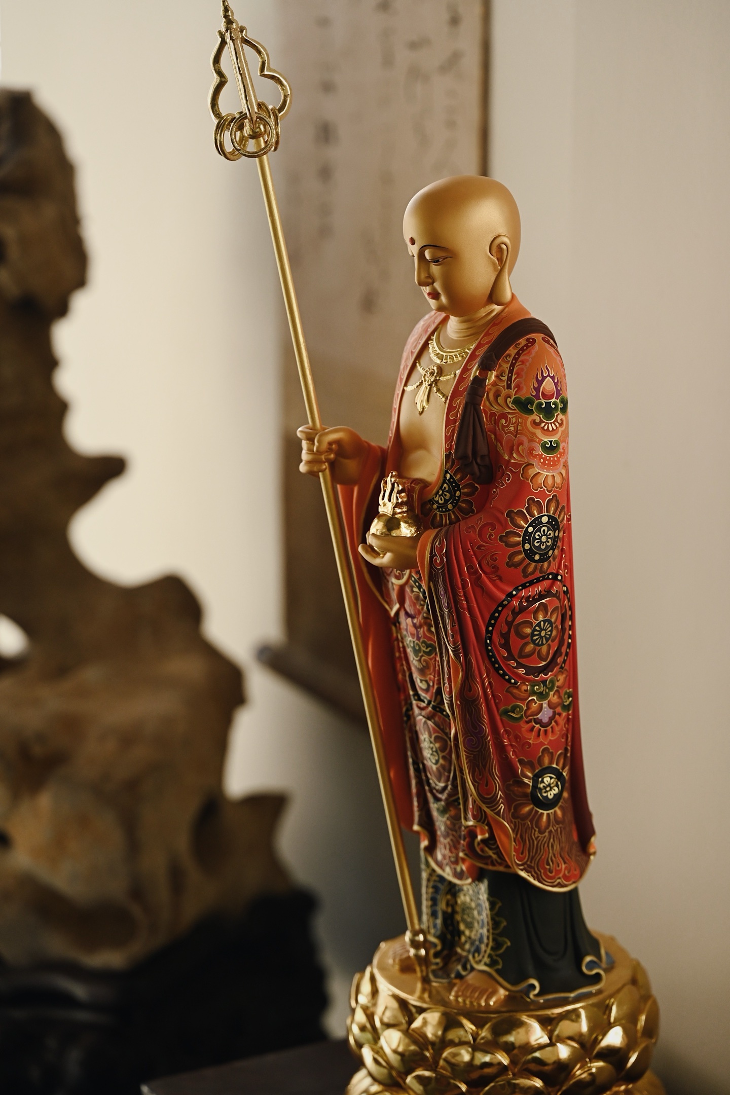 香樟木×彩绘×鎏金 | 地藏王地藏菩萨双目微垂、神态安详,身着僧袍,周身描金银,