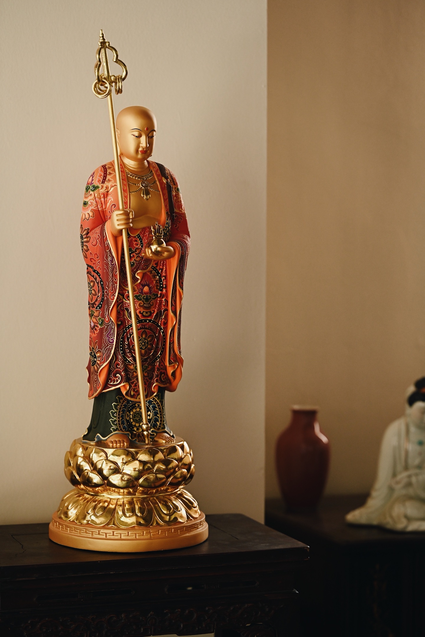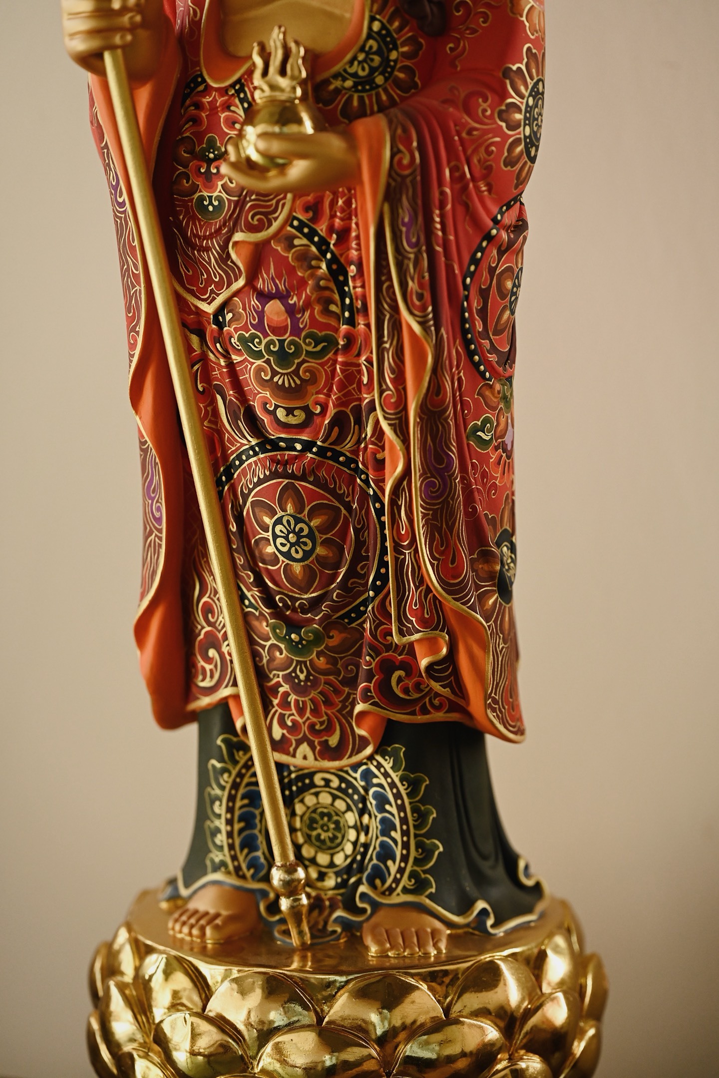 香樟木×彩绘×鎏金 | 地藏王地藏菩萨双目微垂、神态安详,身着僧袍,周身描金银,法相端庄,右手持六环锡杖,左手托莲花宝珠,充满慈悲与力量。20.*20.5*66.5cm 4383g