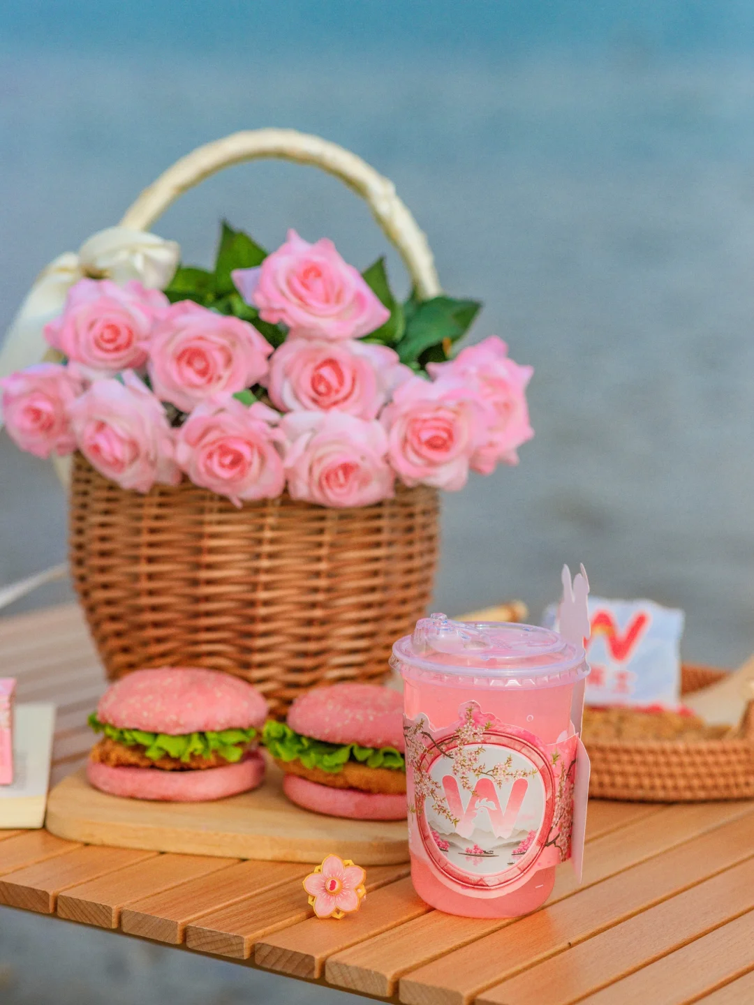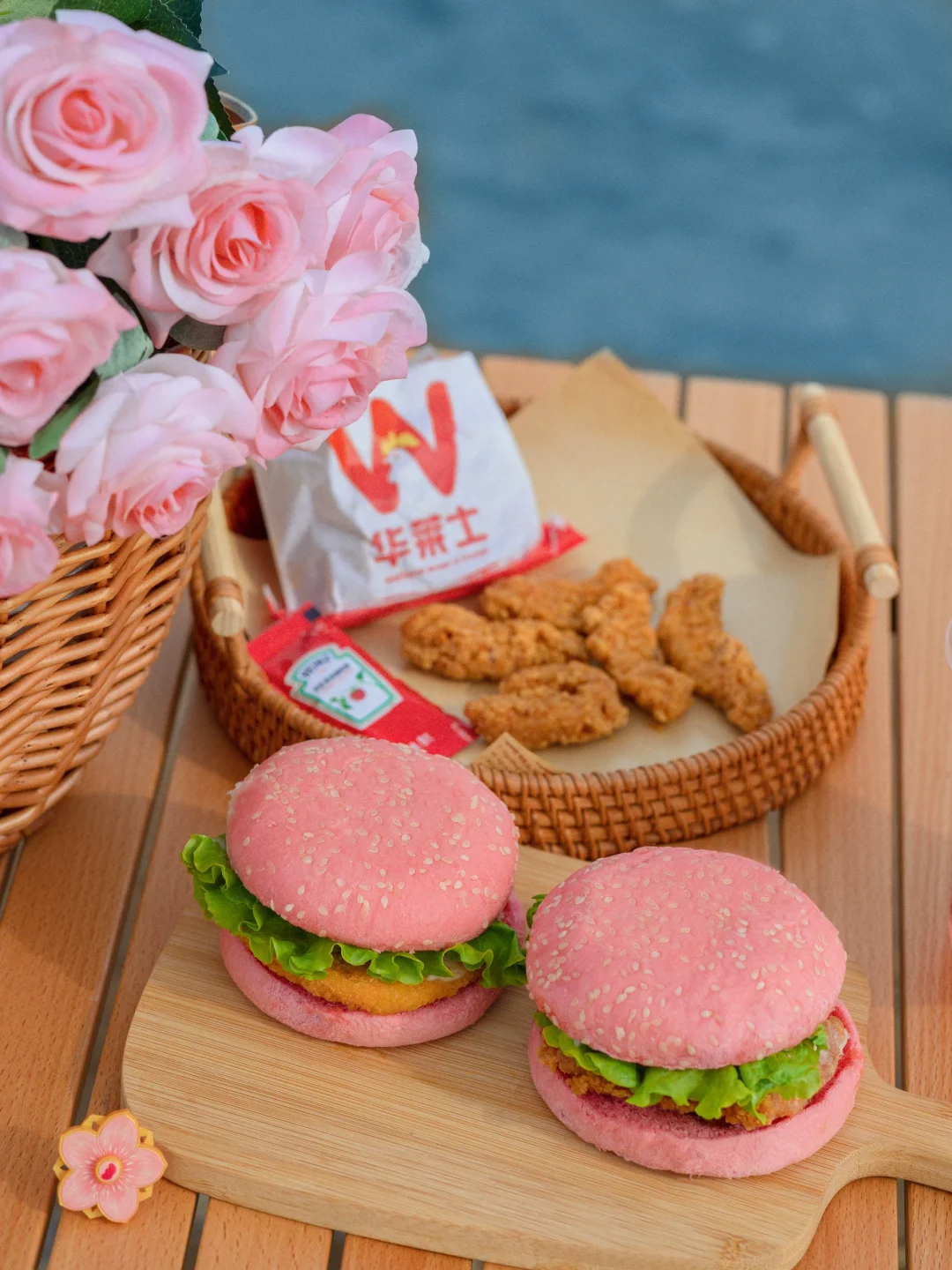 🌸等桃花盛开之时,还要带粉粉的汉堡来野餐~