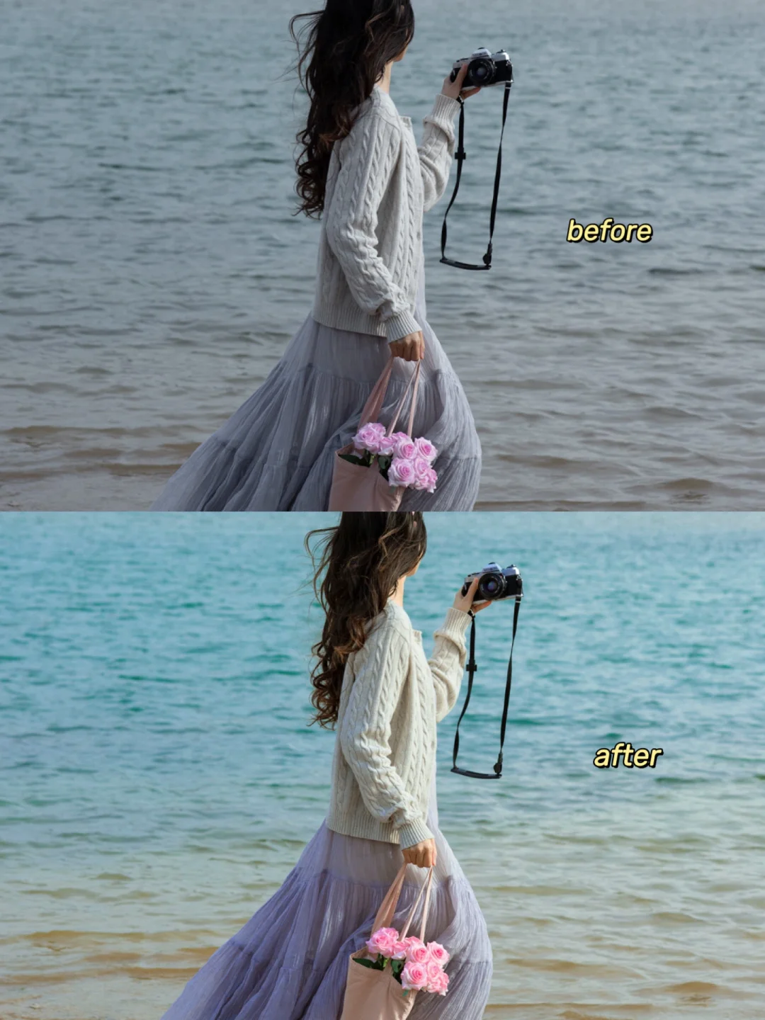 🌊太喜欢这个蓝调的滤镜啦,适用于海边或是湖边,哪怕天气不好,水面灰灰的没有颜色,也能修出通透浪漫的颜色啦~