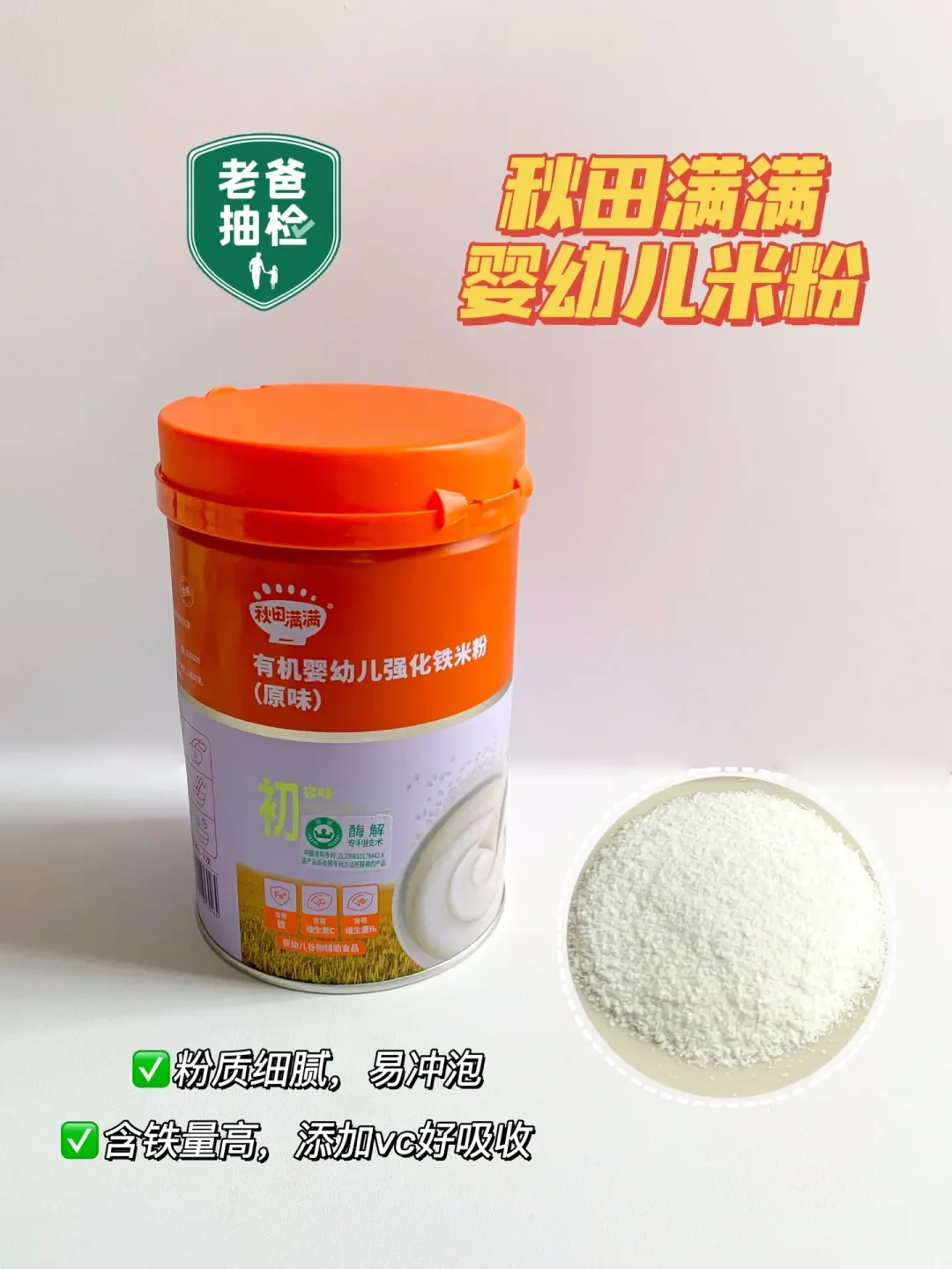✔️我用的是秋田满满Vc加铁有机米粉,铁含量高,满足宝宝日常铁的含量需求,合适做为宝宝第一口米粉,配料表干净,粉质细腻,容易冲泡,不会起坨。
