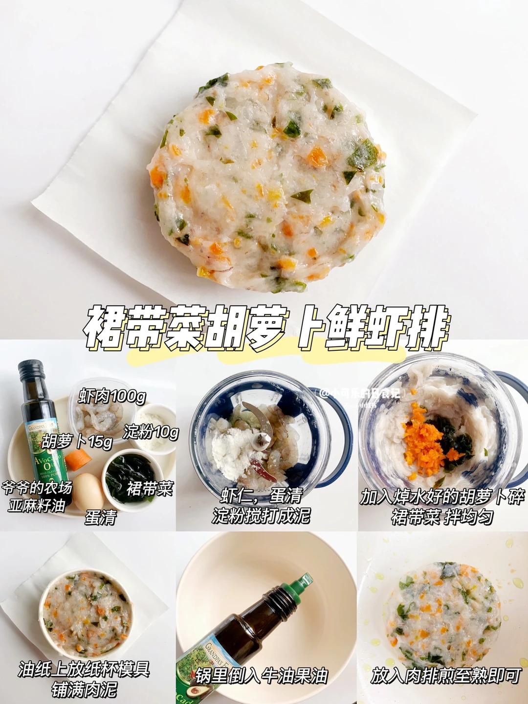 🥣食材:虾仁100克、淀粉10克、胡萝卜15克、裙带菜、蛋清半个