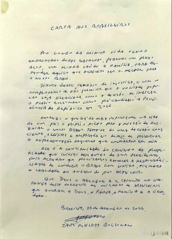 巴西前总统博索纳罗(Jair Bolsonaro)在医院接受疝气手术期间,正式宣布支持其儿子弗拉维奥·博索纳罗(Flavio Bolsonaro)参加2026年总统竞选。博索纳罗目前正在服27年监禁的刑期,罪名是策划政变。 博索纳罗在一封手写声明中做出了这一决定。该声明由弗拉维奥在医院外向记者宣读。 博索纳罗于2025年12月25日(星期四)在巴西利亚的DF Star医院接受了预定的双侧疝气修复手术。医生表示手术过程顺利,没有出现并发症,预计他将在医院住院五到七天。 博索纳罗因试图推翻2022年选举结果而被判有罪,并被禁止在2030年之前竞选公职。他选择儿子弗拉维奥作为接班人的举动震惊了市场,因为投资者原本预计他会支持圣保罗州州长塔西西奥·德弗雷塔斯(Tarcisio de Freitas)等经验更丰富的候选人。 弗拉维奥·博索纳罗目前是一名参议员,他表示自己的竞选旨在巩固其父亲的保守政治遗产。