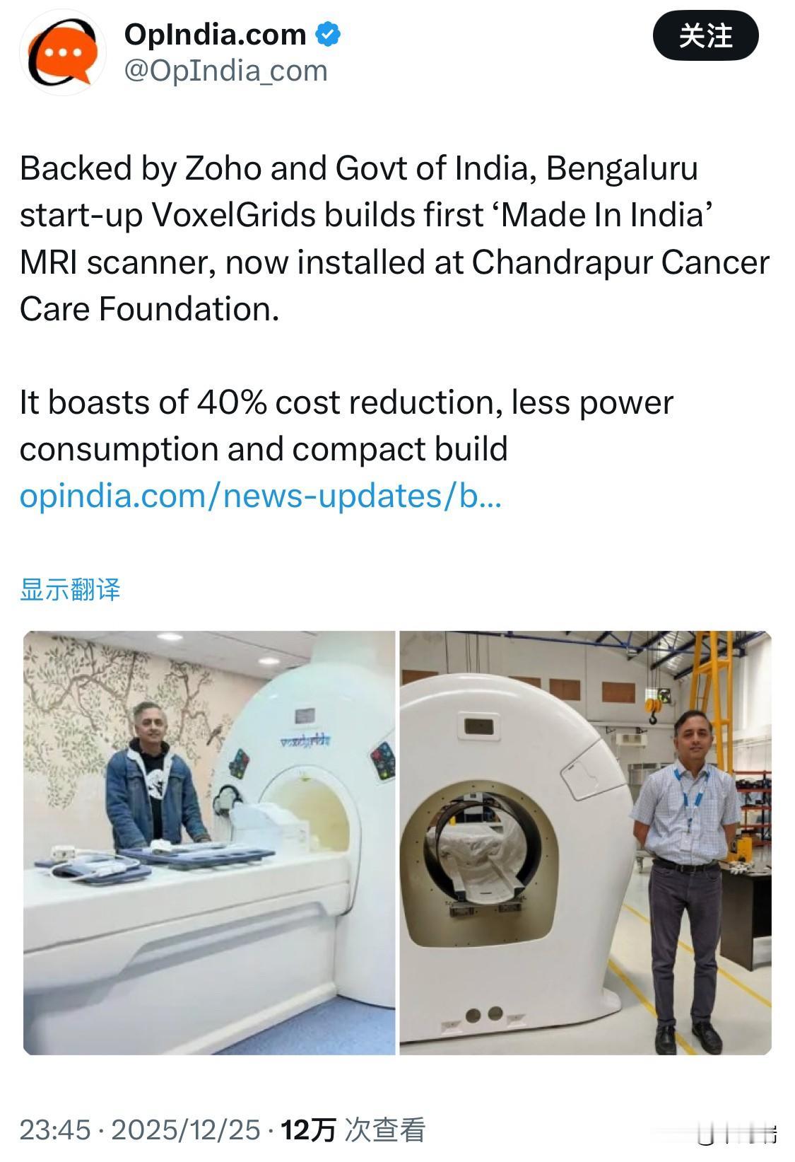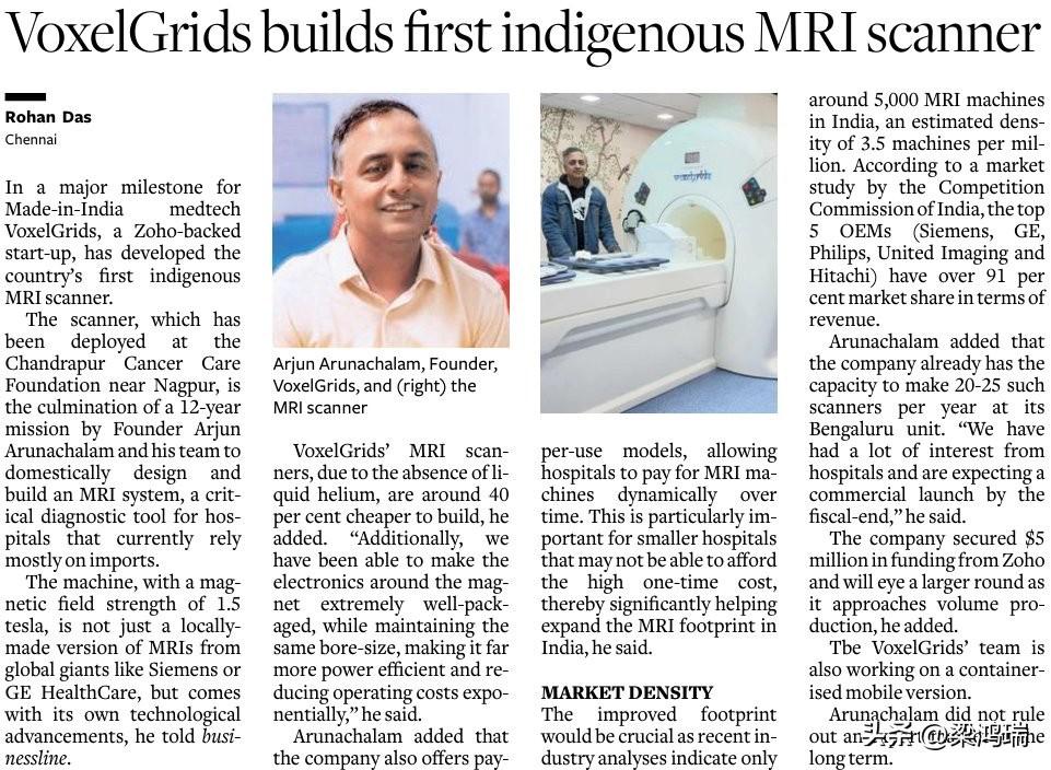 VoxelGrids 公司制造了印度首台国产核磁共振(MRI)扫描仪。该设备已安装在马哈拉施特拉邦的 Chandrapur Cancer Care Foundation 医院并投入使用。 这台1.5特斯拉的核磁共振扫描仪不需要液氦冷却,而是采用传导冷却技术,减少了对稀缺且昂贵的进口液氦的依赖。 由于无需液氦,其建造成本比传统进口型号低约40%。 该设备具有更高的能效和紧凑的设计,功耗更低,甚至可以安装在卡车上用于移动诊断。 目标是使先进的诊断成像技术在印度更实惠和普及,尤其是在二线和三线城市以及农村地区。 该初创公司由 Zoho 公司和印度政府(通过生物技术产业研究援助委员会 BIRAC)共同支持。