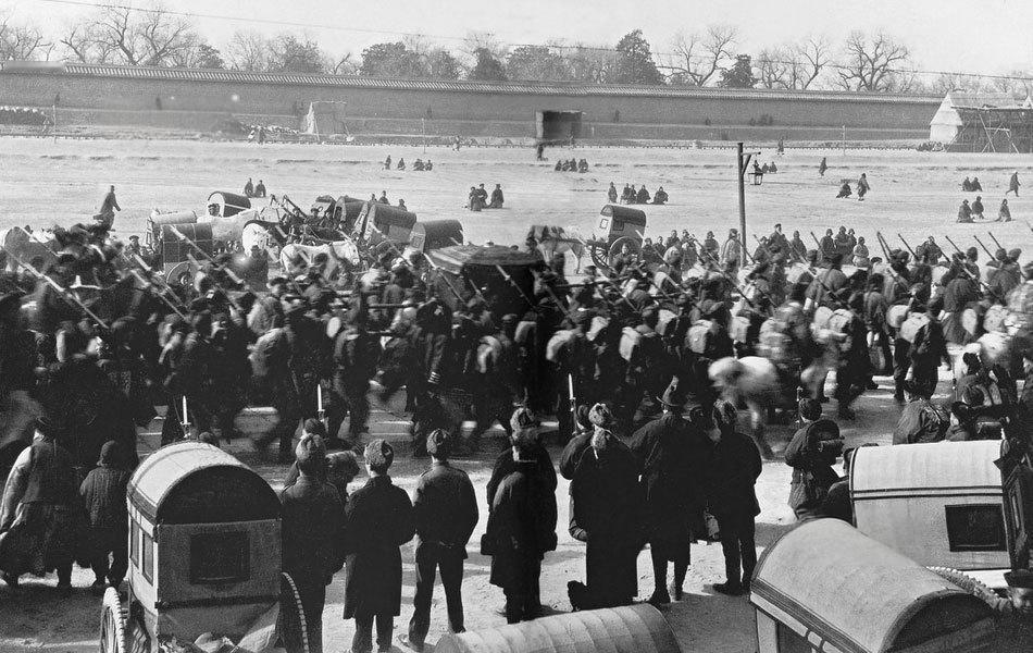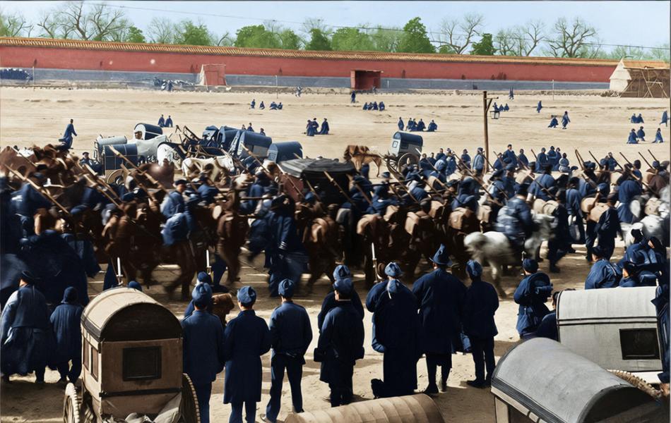 1902年1月8日,慈禧太后与光绪皇帝结束西逃、在袁世凯军队护送下返回北京紫禁城。 1901年《辛丑条约》签订后,清政府获列强“默许”返回北京,遂于1901年10月从西安启程,1902年1月抵达北京,全程由袁世凯所部北洋军(当时已扩充为华北地区主力)负责护卫,照片中的军队、车辆正是这一行程的写照。 照片中可见北洋军士兵持枪警戒、车辆队伍随行,周边还有围观的民众;此时的清王朝虽名义上“恢复统治”,但实际已完全受制于列强,“回銮”更像是在列强默许下图存的象征,而袁世凯的军队则借此次护卫进一步巩固了自身在华北的军事地位。