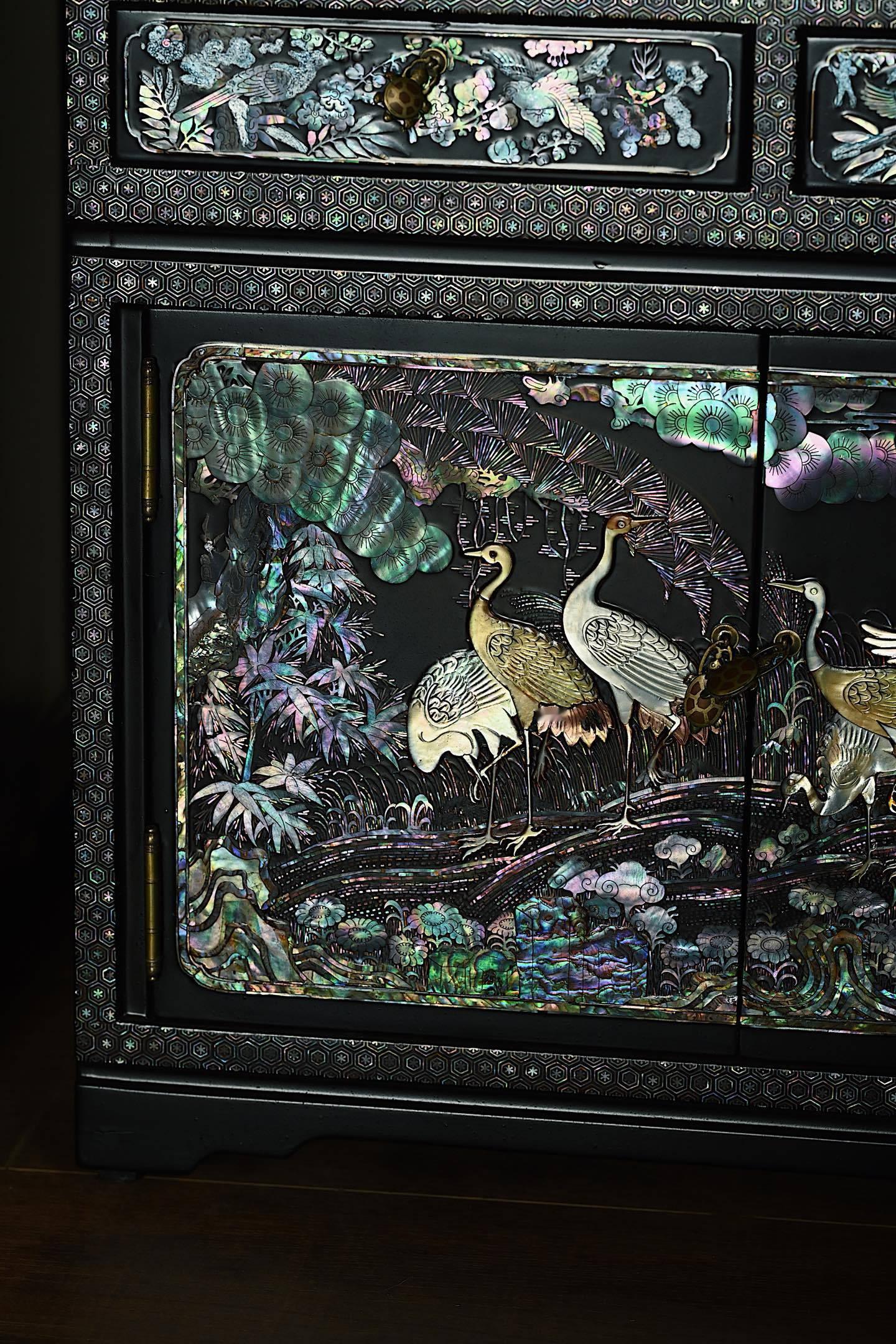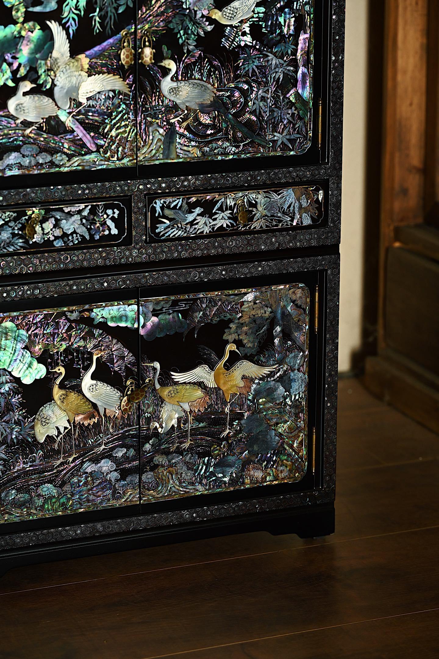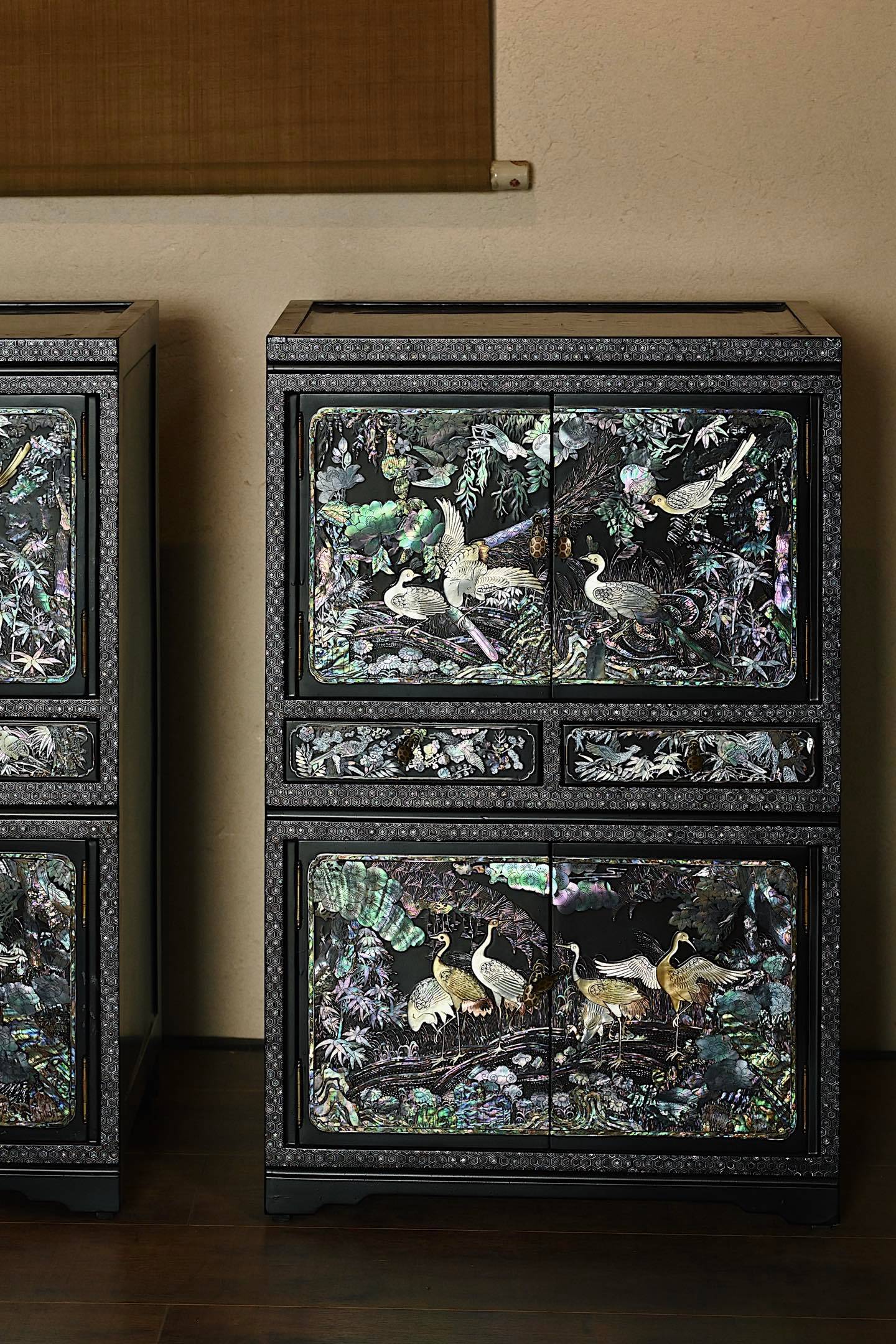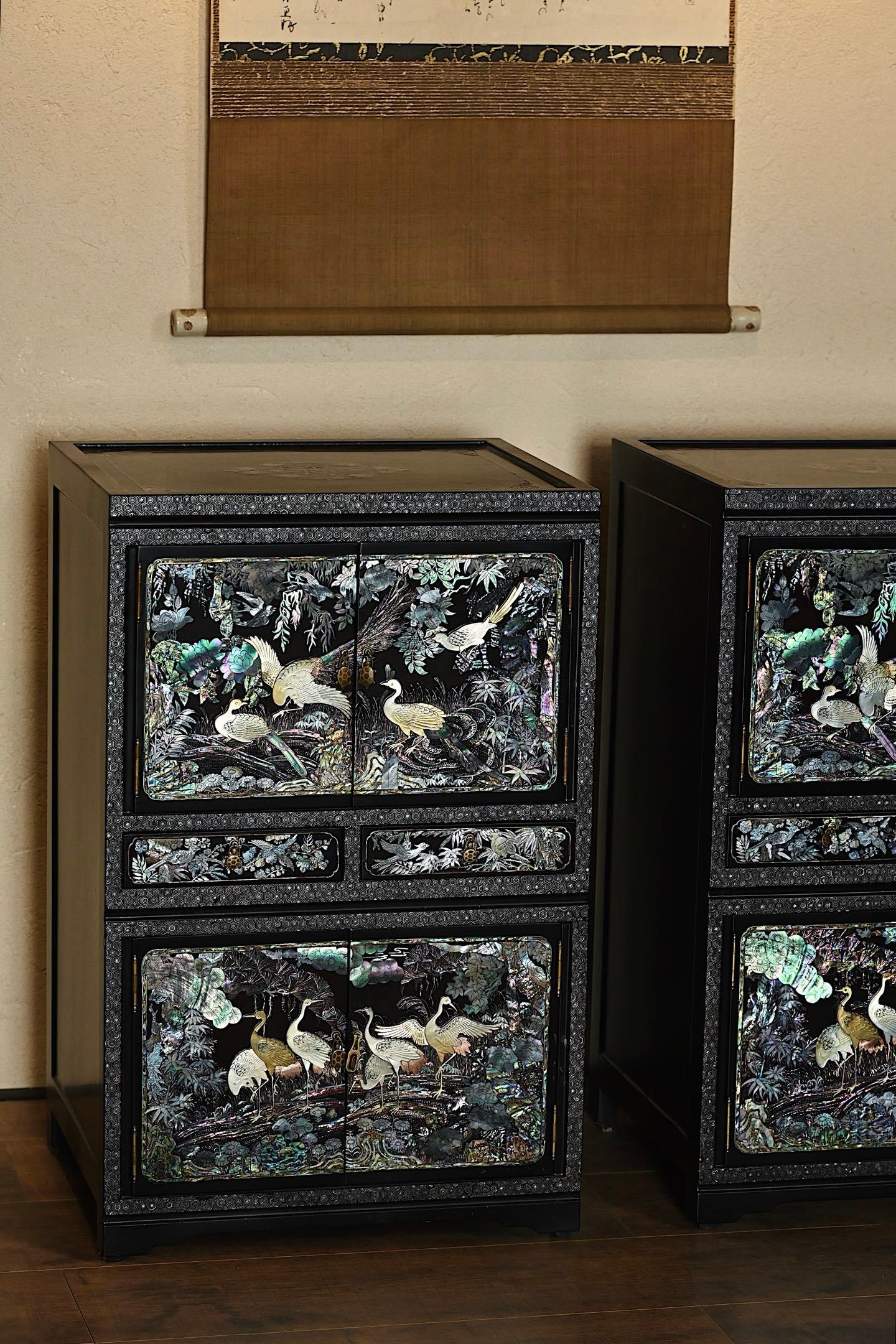回流 螺钿 | 富贵吉祥 柜子(一对)近代回流品,有磕碰等正常岁月痕迹,木胎髹大漆为底,通景以螺钿嵌孔雀富贵典雅,瑞鹤伫立,苍松掩映,画面饱满,流光溢彩,装点空间、收纳物品,瑞气满盈。单个尺寸45.5*37*71cm