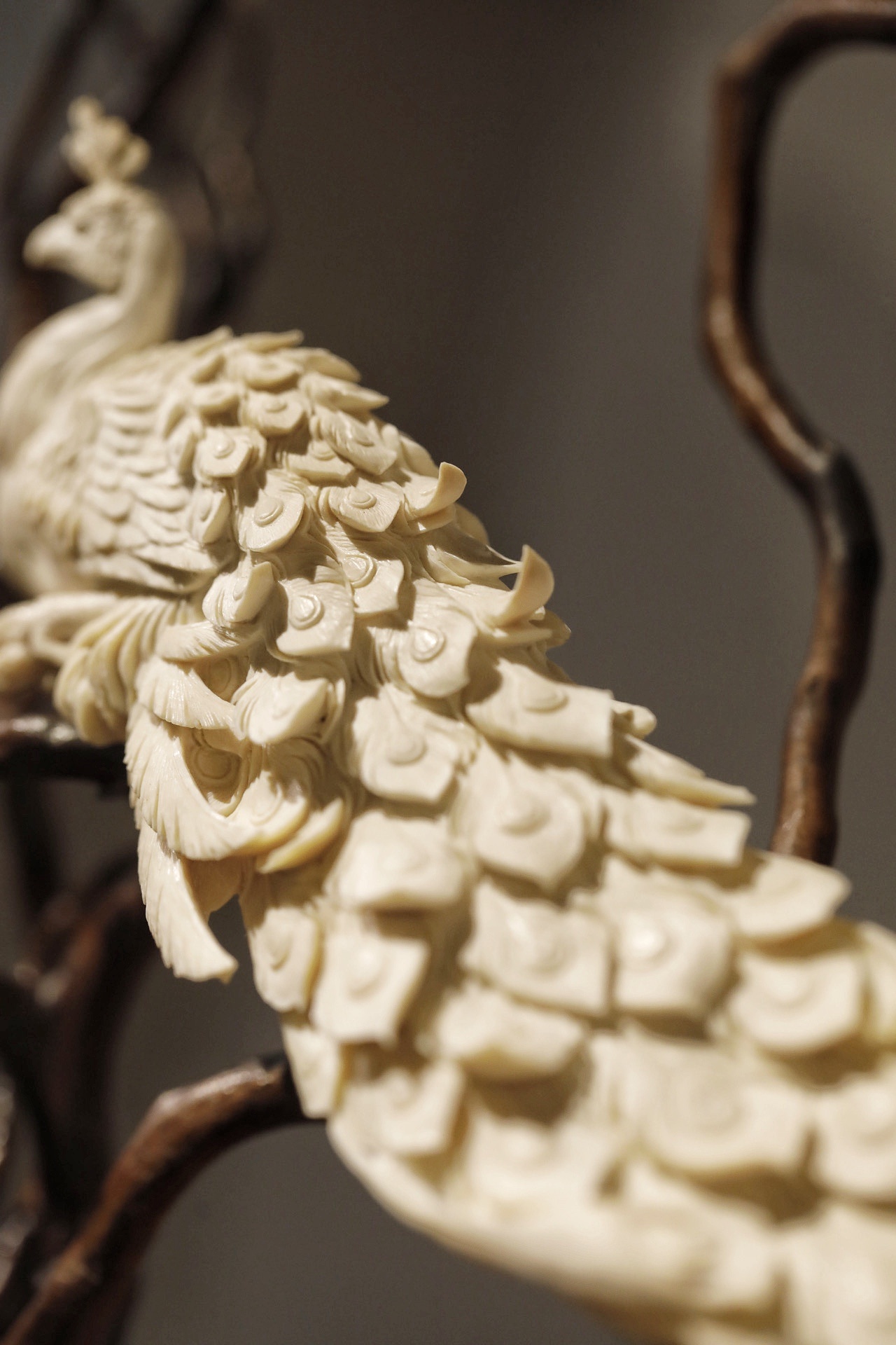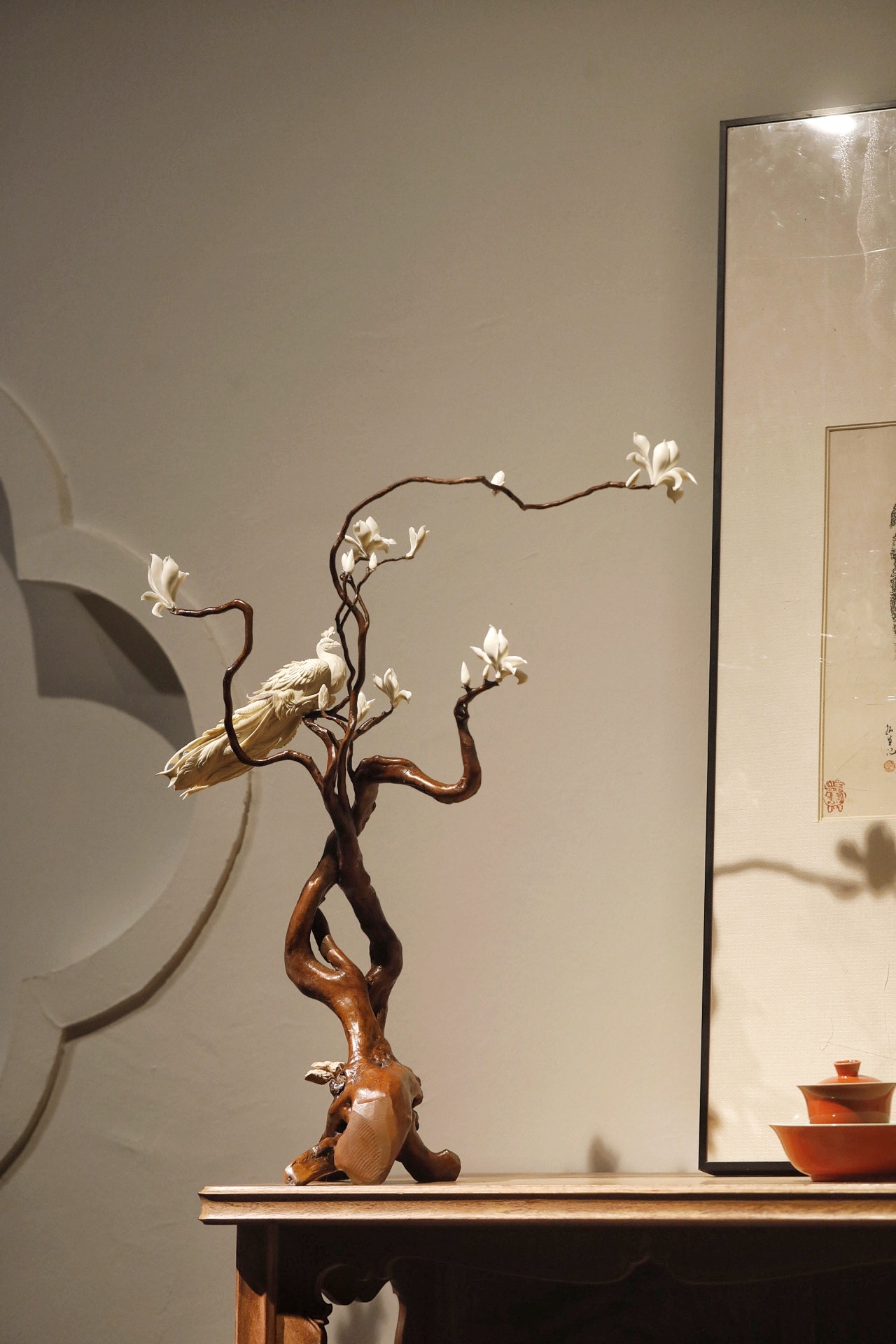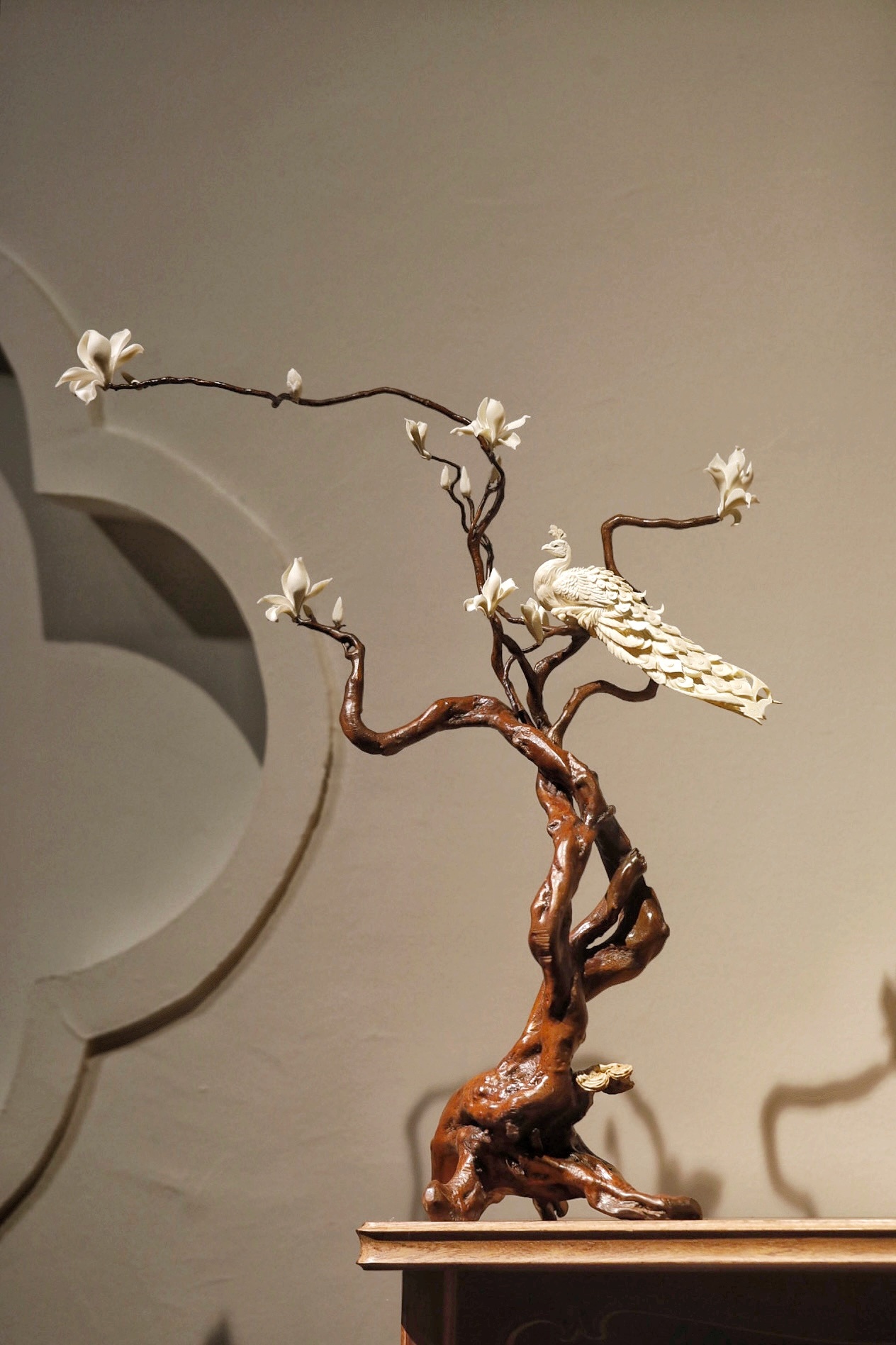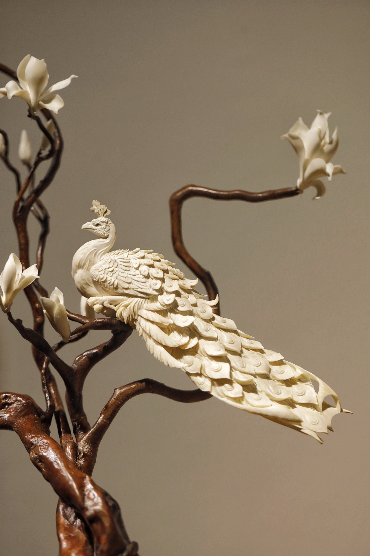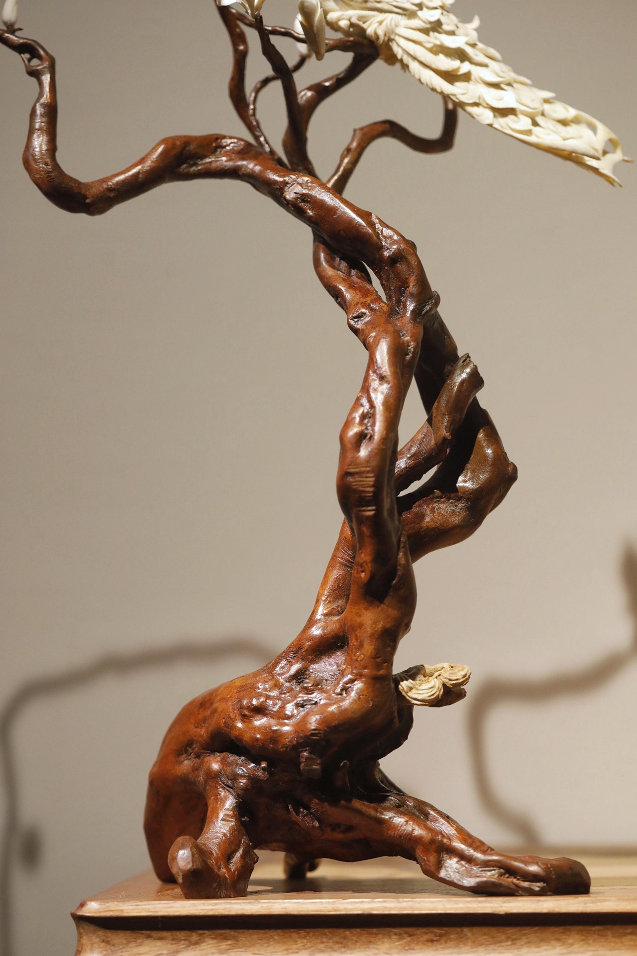 猛犸x鹿角x杜鹃根 | 玉堂富贵·摆件色泽温润古雅,雕琢尽显拙趣。杜鹃根天然成势,鹿角嵌玉兰含芳,猛犸雕孔雀翎羽层层,穿眼贯通见巧思,置室招财纳福,清朗雅致。规格:50×20×58cm重量906g