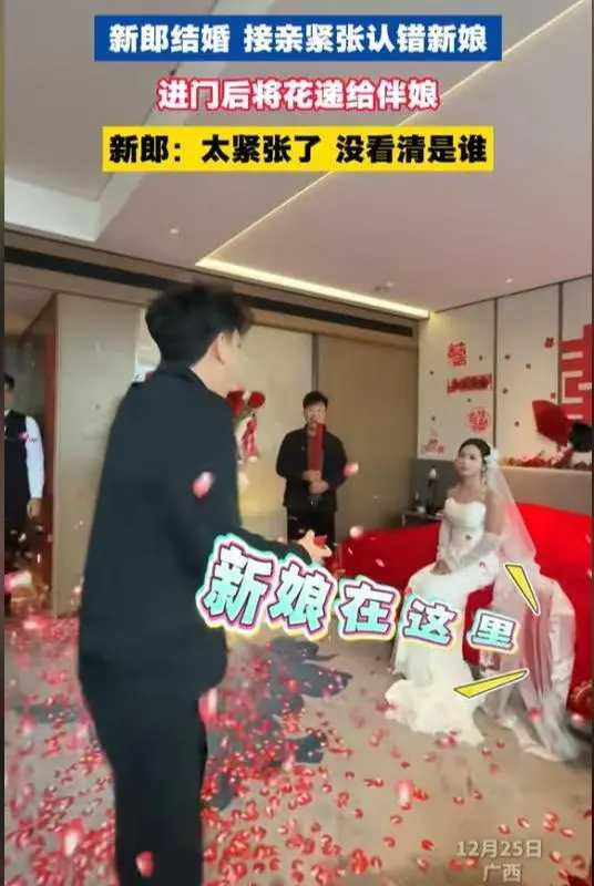 新娘当场变脸 越解释越遭网友吐槽 “老婆我来接你了!”12月25日,广西一场热闹的婚礼接亲现场,新郎高喊着口号推门而入,满室礼花纷飞,浪漫氛围拉满。 新娘身着洁白长裙,早已端坐在床边,笑着张开双臂,满心期待地等着新郎奔向自己。谁料新郎高举着手捧花,径直越过新娘,朝着镜头前的伴娘递了过去。 身后的新娘瞬间收起笑容,错愕地看着眼前的一幕,原本伸开的双臂也默默垂下。好在旁边伴娘及时提醒,新郎才猛然回过神,赶紧转身跪抱新娘道歉,但新娘脸上的笑意早已消失殆尽。 为了不留遗憾,众人商议让新郎重新走一遍接亲流程。可重来的仪式里,新娘没了最初的雀跃与期待,两人的互动更像一场生硬的表演,喜庆氛围大打折扣。 据悉,这对新人从订婚到领证再到办婚礼,前后不过十几天,进展十分迅速。而这场乌龙事件被发到网上后,迅速引发热议。网友纷纷吐槽,新娘端坐床边是常规流程,就算现场人多、礼花遮挡视线,也不该认错人。 面对舆论,新郎出面解释,称自己是当天太过紧张,加上屋里人多太懵才闹出笑话。但这个说法并未得到网友认可,大家纷纷替新娘抱不平:一辈子一次的婚礼,遇到这种事谁能不膈应? 婚礼仪式最终还是圆满完成了,但这场接亲乌龙,恐怕会成为新人心中一道难忘的小插曲。至于日后生活能否恩爱如初,还得看新郎如何用行动弥补这份遗憾。