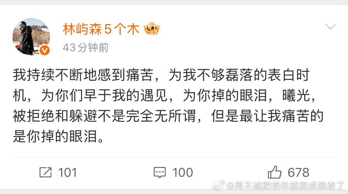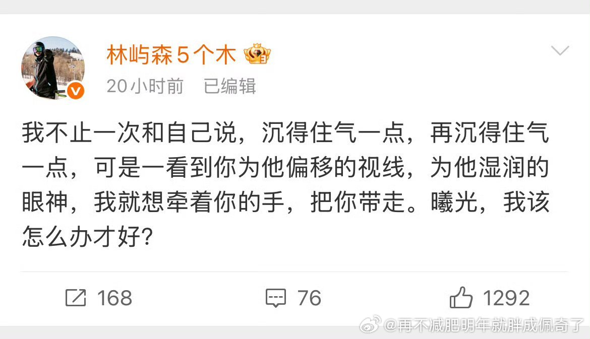 看得出骄阳的宣发和杨小贝一样有钱但没品居然营销林屿森的微博林屿森的人设能发这样的微博?想想何以琛微博公开“默笙,我不止一次对自己说,沉得住气一点,7年,被躲避不是完全无所谓,为你我掉的眼泪……”笑掉大牙了 微博就是语cos,要符合人设ok?想象韩商言微博会公开在他和佟年分手那天“年年,我不止一次对自己说,沉得住气一点,为我不够磊落的放手,我多想牵着你的手,把你带走…”yue