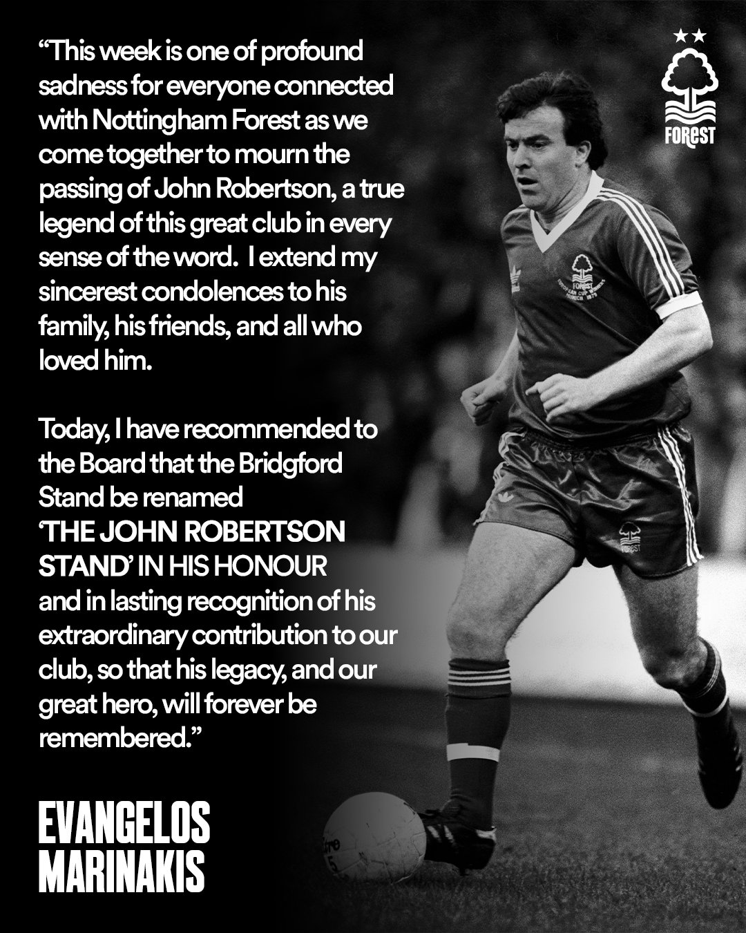 虎扑12月27日讯森林传奇球星约翰-罗伯逊在昨天去世。森林老板,希腊船王马里纳基斯今天在森林官方社媒表态,表示已经向董事会提议将森林球场的西侧主看台布里奇福德看台改名为约翰-罗伯逊看台。