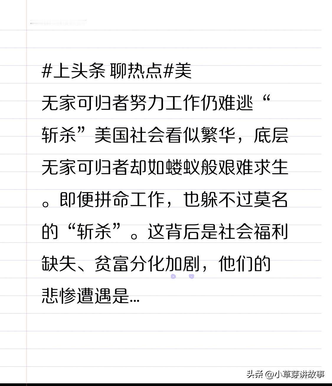 美无家可归者努力工作仍难逃“斩杀” 美国社会看似繁华,底层无家可归者却如蝼蚁般艰难求生。即便拼命工作,也躲不过莫名的“斩杀”。这背后是社会福利缺失、贫富分化加剧,他们的悲惨遭遇是美国所谓“人权”遮羞布下的真实疮疤。