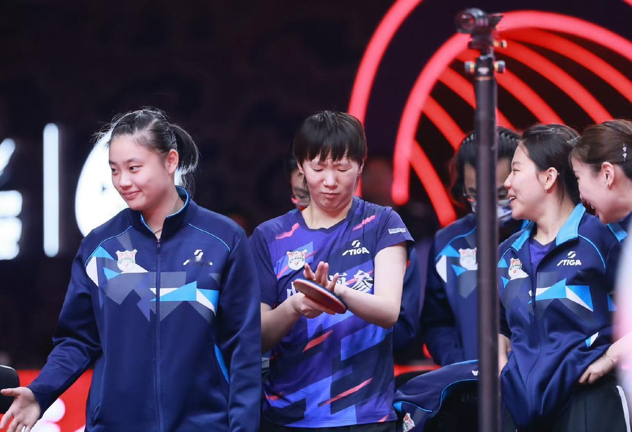 南京乒超联赛总决赛女子半决赛,王曼昱再次上场,以3-1战胜李雅可后,山东鲁能俱乐部大比分3-1战胜华东理工大学俱乐部。王曼昱一单二分分别战胜王艺迪和李雅可立大功。 比赛结束,王曼昱回到鲁能场边和队友击掌,陈幸同拉着曼昱的手表示感谢!曼昱还拿着自己拍子在自己小肚子上蹭蹭,大家有说有笑,都非常开心终于晋级决赛!