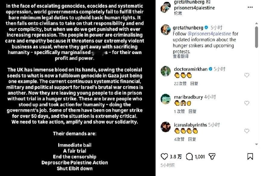 一个喊着“反对种族灭绝”的女孩,被用《反恐法》给抓了。 你没看错,就是那个瑞典环保少女。 这事儿魔幻到我一时都不知道从哪儿开始吐槽。 她跑到一家保险公司门口抗议,因为这家公司给以色列的国防项目提供服务。 她手里举的牌子,是个人都看得懂,反对种族灭绝,声援巴勒斯坦。 结果呢?英国警察来了,咔嚓一下,违反《反恐法》,带走。 这法律简直是为他们量身定做的。 先把一个叫“巴勒斯坦行动”的民间组织,直接打成“恐怖组织”。 然后,任何支持这个组织的人,哪怕只是举个牌子,念句口号,好家伙,你也是恐怖分子。 据说已经有几千人因为这个进去了。 最让人心梗的,是里面还有两个学生,已经绝食52天了。 52天啊,水米不进,命都快没了,就想见司法大臣一面。 结果呢?拒见。 这哪是法治,这分明就是:“我说你是什么,你就是什么,你闭嘴。” 想想就有意思。 之前她在加沙送物资,被以色列那边揪着头发、关在有臭虫的牢里虐待,西方世界集体静音,屁都不放一个。 现在她站出来替巴勒斯坦说了句话,英国倒第一个跳出来,急吼吼地把人给拷了。 一边给军火商当保镖,给战争递刀子;一边用14年监禁的“反恐大棒”吓唬自己家手无寸铁的老百姓。 这操作,这双标,我都替他们脸红。 这套把戏,恐怕连他们维多利亚时代的殖民者祖宗看了,都得羞愧地感叹一句:还是你们会玩。