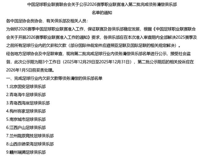 12月26日晚,中足联官网发布公告,公布了2026赛季职业联赛准入第二批完成债务清偿俱乐部名单。并未出现在第一批名单上的北京国安俱乐部这次上榜,扫清了下赛季联赛准入的障碍。