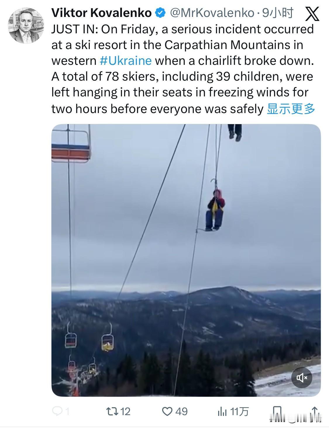 最新消息:周五,乌克兰喀尔巴阡山脉滑雪场发生严重事故,缆车发生故障,导致包括39名儿童在内的78名滑雪者被困在座位上,在凛冽的寒风中煎熬了两个小时,最终全部安全获救。 事件发生在2025年12月26日(星期五),乌克兰利沃夫州沃洛相卡村的扎哈尔·伯库特山(Mount Zakhar Berkut)滑雪场。 事故原因:缆车因故障停止运行。 被困人数:事发时约有80人被困在缆车上。 救援行动:乌克兰国家紧急服务局的76名救援人员和13台专业设备参与了救援行动。救援行动持续了两个小时。 结果:所有被困人员均被安全撤离,没有人员伤亡报告。