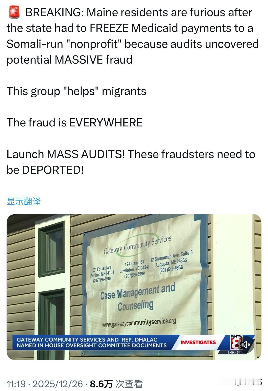 突发事件:美国缅因州 DHHS 暂停向 Gateway Community Services 付款,原因是审计发现了涉及数百万美元的潜在欺诈指控。美国众议院监督委员会已要求提供与此案和缅因州众议员德卡·达拉克(Rep. Deqa Dhalac)有关的文件,作为其更广泛调查的一部分。 调查详情 一名告密者声称,Gateway Community Services(GCS)开具了从未提供过的服务的账单,并伪造记录以支持欺诈性报销。这些指控包括操纵员工跟踪系统以制造虚假的客户访问记录。 缅因州卫生与公共服务部(DHHS)进行了三次审计: 第一次和第二次审计(涵盖 2015 年至 2018 年)发现 GCS 被多付了约 66.2 万美元。 第三次审计(涵盖 2021 年 3 月至 2022 年 12 月)发现 GCS 被多付了超过 100 万美元。 州政府DHHS 已暂停向 GCS 支付 MaineCare(该州的 Medicaid 计划)款项,并指称存在可信的欺诈指控。此举通常会触发将案件移交司法部长办公室进行调查。 美国众议院监督委员会主席詹姆斯·科默(James Comer)已要求财政部提供与 GCS 相关的可疑活动报告,将缅因州的调查与明尼苏达州一项涉及数亿美元社会服务欺诈的更大范围调查联系起来。 缅因州众议员德卡·达拉克(Deqa Dhalac)是该组织的共同创始人,曾担任助理执行董事,她的名字在众议院监督委员会的文件要求中被提及。该组织的首席执行官阿卜杜拉希·阿里(Abdullahi Ali)也被指控将海外资金用于索马里准军事组织。 GCS 否认了这些指控,称其虚假,并表示拥有严格的计费和合规协议。该组织指责媒体报道加剧了针对索马里社区的威胁。 缅因州居民和议员呼吁对该州的 Medicaid 系统进行全面审计和调查,以确保纳税人的资金得到妥善使用。