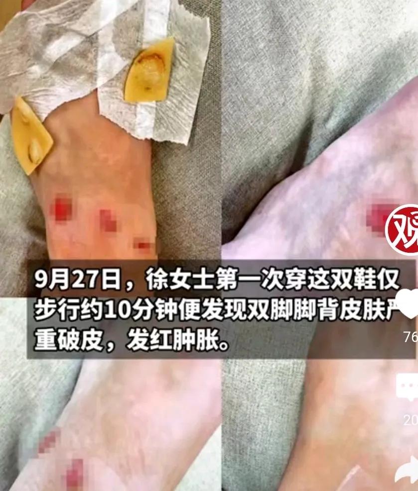 上海一女子在LV实体店买了一双9250元的运动鞋,第二天女子第一次穿这双鞋出去, 走了不到十分钟, 发现双脚脚背皮肤严重破皮,发红肿胀, 此后女子发现伤口始终无法愈合, 将近一个月后,伤口恶化, 她去医院进行治疗, 被告知要进行整形手术去掉伤疤, 女子多次联系实体门店, 要求退货并进行相应赔偿, 对方仅同意更换鞋子, 并对女子说穿新鞋必须要穿袜子,不穿袜子都会破皮儿。 女子说买鞋时, 对方并未告知新鞋要穿袜子,不穿袜子会造成磨损。 女子去门店问服务员为什么不告知自己新鞋要穿袜子? 服务员只说是因为她的脚皮肤比较嫩,比一般的人容易破损,没有回答问题。 网友说,人傻钱多,这么贵的鞋还要自己走路呀, 这种品牌鞋是装+逼用的!