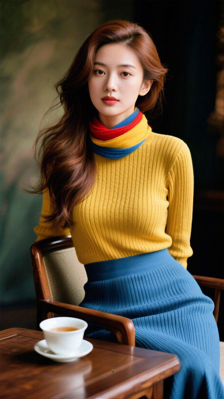 《暖衫栖满秋光》 午后的光轻覆木椅时,她静坐在那里,像揉进室内的一捧秋阳。明黄毛衣裹着软绒的温,颈间红与蓝的叠色,似把天际的浅霞凝作了围巾的褶皱。 发梢卷着风的轻缓,垂落肩侧时,连茶盏里的暖雾都漫得慢了些。茶息裹着淡香散开,衬得衣间的黄更柔,蓝更清,像把整个秋的舒展,都收进了这一方静处。 她抬眼的片刻,光落在眉梢,连空气里的浮尘都沾了暖——像寻常日子里撞见的一抹妥帖,让人忽然想把这刻的温软,也织进自己的日常里。 秋日温软穿搭 暖调生活感