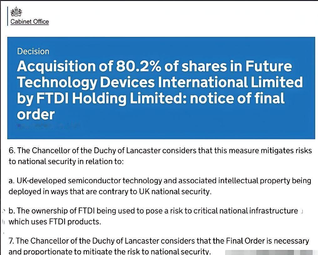 英国又出手了!继荷兰强夺中资持有的安世半导体之后,伦敦也以“国家安全”为名,逼迫中国建广资产交出其在FTDI公司80.2%的股权。 可能很多人没听过FTDI这名字,但这公司手里的技术硬得很!它是全球USB桥接芯片的领军者,1992年就在英国格拉斯哥成立,核心业务就是设计那种能让USB接口和串口设备互通的芯片,工业控制、汽车电子这些刚需领域都离不开它,市场占有率一度飙到70%以上。建广资产当初收购它可不是一时脑热,2021年就和电连技术联手筹备,2022年2月通过英国孙公司实打实砸了4.14亿美元——其中3.64亿是自有资金,5000万是境外银行并购贷款,换算成人民币差不多27.9亿,才拿下这80.2%的股权,每一分钱都来得明明白白。你想想,中企合规走流程、花真金白银收购的资产,怎么突然就成了“国家安全威胁”?这说法简直站不住脚! 英国政府拿出来的挡箭牌是《2021年国家安全与投资法》,2024年11月6日直接下了行政命令,要求中资在一年之内必须出售全部股权。更离谱的是,这起收购2022年就完成了,而这部法案2022年1月才生效,英国居然动用了“追溯权”倒查,这操作跟耍流氓有啥区别?他们宣称担心“半导体技术和知识产权被滥用”,可建广控股的两年里,FTDI的技术研发没停过,业务也没出任何乱子,怎么早不担心晚不担心,偏偏现在跳出来?说白了,就是看中国企业掌握了核心技术,心里不踏实,拿“国家安全”当借口抢蛋糕! 这已经不是英国第一次这么干了。之前闻泰科技旗下的安世半导体,收购了英国纽波特晶圆厂(NWF),都通过两次安全审查了,结果英国还是用同一部法案,强制要求剥离86%的股权,最后这工厂被美国企业低价接盘。短短几年里,英国用这招干预了8笔涉华投资,过去一年审查的对英投资里,超过40%都跟中国有关,比例比任何国家都高。英国副首相还嘴硬说中国是“最大国家威胁”,却不敢承认自己是在抱美国大腿——脱欧后没了欧盟靠山,只能靠打压中企向美国表忠心,甘愿当别人的马前卒。 要知道,国际上有个“双边投资保护协定”,核心就是保护跨国投资者的合法权益,禁止东道国随意征收或强制剥离股权,英国和中国早就签署过相关协定。建广资产的收购完全符合英国法律和国际规则,英国这种单方面撕毁商业契约的行为,不仅坑了中企,更砸了自己的招牌。你想想,连合规投资都能被随意掠夺,以后哪个国家的企业还敢去英国做生意?之前安世半导体被荷兰干预时,中方直接出手管制相关产品出口,让安世的全球供应量锐减六成,欧美车企都面临“缺芯”困局,英国就不怕重蹈覆辙? 更讽刺的是,英国口口声声标榜“市场经济”,却用行政命令直接干预企业经营,这和他们一直批判的“非市场行为”简直是自相矛盾。FTDI的技术确实重要,但中企收购后并没有限制技术输出,反而持续投入研发,给英国带来了税收和就业。现在一刀切断合作,受损的不仅是中企的利益,还有英国本土的产业链和技术生态。这种短视行为,本质上是对国际投资规则的破坏,也是对自身营商环境的自残。 大家想想,要是每个国家都学英国,拿“国家安全”当借口,想抢哪家企业就抢哪家,全球产业链还能稳定吗?你觉得中企面对这种不公,除了法律维权,还该用哪些方式保护自己的合法权益?国际投资领域里,“追溯审查”这种操作该不该被禁止? 英国这种泛化国家安全概念、滥用国家力量的做法,已经引起了国际社会的反感。中国外交部早就明确表态,这严重违背市场经济原则和国际贸易规则,英方必须尊重中国企业的正当权益。可英国现在一门心思跟着美国打压中国科技,完全不顾自身经济利益,这种饮鸩止渴的做法,迟早会反噬自己。 各位读者你们怎么看?欢迎在评论区讨论。