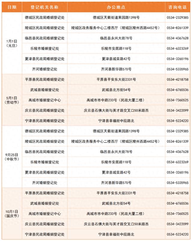 德州市婚姻登记机关2026年节假日预约登记安排表