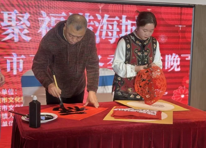 晚会现场的文化互动环节同样吸睛。书法家现场挥毫,笔走龙蛇间,一幅幅寓意吉祥的“福”字跃然纸上,刚劲笔触承载着对新年的美好期许;剪纸非遗传承人带来精心创作的剪纸作品,花鸟鱼虫、吉祥纹样在指尖灵动绽放,尽显传统民俗魅力。两位艺术家将饱含心意的福字与剪纸作品现场赠予村民代表,让大家在感受艺术熏陶的同时,收获满满的节日祝福,也让优秀传统文化在互动中扎根基层。
