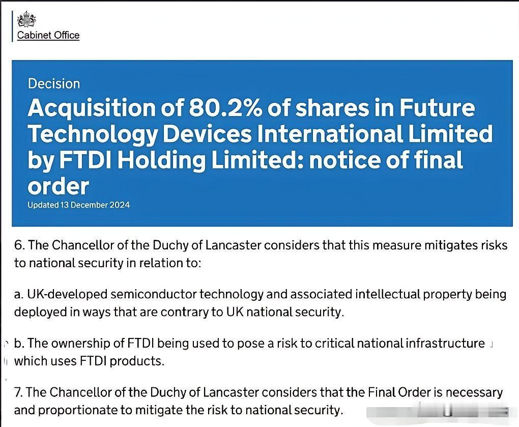 英国又出手了!继荷兰抢夺中资持有的安世半导体之后,伦敦也以“国家安全”为名,逼迫中国建广资产交出其在FTDI公司80.2%的股权。 这哪是什么国家安全审查,分明是明火执仗的强取豪夺!中资企业真金白银合法收购的股权,说要交出来就得交,连个站得住脚的具体理由都拿不出来。 先说说这FTDI公司,1992年在英国格拉斯哥成立,主营USB转串口这类通用芯片,客户里早年还有IBM,技术根本算不上什么涉密尖端,全球很多电子设备都在用。 建广资产2021年12月花4.14亿美元买下这80.2%股权时,手续全合规,当时英国那部《国家安全与投资法》还没生效,现在倒好,直接拿后出的法律回溯审查。 英国这法案2022年1月才生效,却能管到2020年11月之后的交易,这种“事后算账”的操作,让海外投资者心里发毛,谁还敢放心在英国投钱? 再看荷兰那边的安世半导体,更离谱,被荷兰政府冻结全球资产,罢免中方CEO,99%股权被第三方托管,理由也是模糊的“经济安全风险”,背后全是美国的影子。 安世半导体是中国闻泰科技的子公司,中国区营收占比快一半,荷兰搞强制托管后,中方直接出台出口管制,断了它关键元器件供应,真是搬起石头砸自己的脚。 英国政府说FTDI股权会威胁关键基础设施,可连最基本的风险证据都没披露。这种泛化国家安全的做法,就是在破坏自己多年积累的营商环境。 建广资产不服,申请临时救济还被英国法院驳回,按照市场推算,2025年12月底就是强制出售的最后期限,这简直是逼着中资企业认亏离场。 欧美国家嘴上喊着自由市场、契约精神,真到中资企业投资盈利了,就露出真面目,用行政手段强行干预,吃相实在难看。 这些通用芯片领域的并购,本来是全球产业链互补的好事,现在被政治操弄搞得乌烟瘴气,最终只会让全球半导体产业发展受阻。 中国企业海外投资越来越谨慎,不是不想走出去,而是怕遇到这种“煮熟的鸭子飞了”的风险,毕竟谁的钱都不是大风刮来的。 英国这么干,看似针对中资,实则是在砸自己的招牌。以后不管哪个国家的企业,想到英国投资都会多留个心眼,生怕哪天就被“国家安全”找上门。 这种单边主义、保护主义的做法,正在撕裂全球经贸秩序。今天能对中资下手,明天就能对其他国家企业动手,没有谁是绝对安全的。 各位读者你们怎么看?欢迎在评论区讨论。