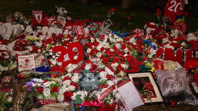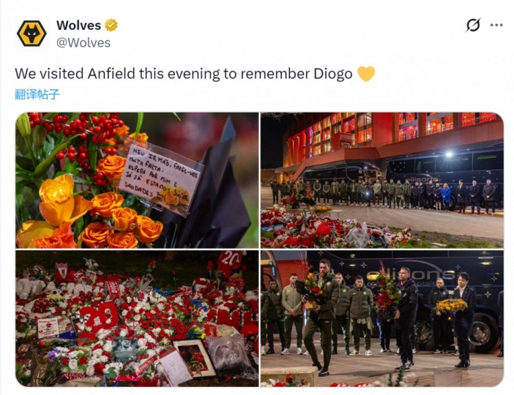狼队球员们比赛前一天晚上来到安菲尔德球场献花,缅怀因车祸去世的前利物浦球员若塔。