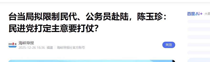 就在刚刚   台当局突然宣布,   12月26日,台当局宣布,即日起要通过《两岸人民关系条例》修法,不光所有公务员赴大陆要被管控,连立委这种民选公职人员,去大陆都得先过“审查许可”这一关,要是敢违规去,直接罚200万到1000万新台币!   这道禁令看着突然,背后是一场已经进行了很多年的身份认同塑造工程。   教科书,就是他们最重要的阵地。翻开现在的课本,“郑成功收复台湾”变成了“郑氏政权对台湾的军事入侵”,“抗日战争”也被悄悄换成了“日华战争”。   甚至连“开罗宣言”这种国际法理文件,都有人公开说成是“谣言”。这么做的目的很明显,就是想从根子上一点点剪断历史的连接。   效果怎么样?数字很说明问题。1992年,台湾还有超过四成的年轻人,大方承认自己是中国人。可到了2023年,这个数字已经掉到了两成以下。   按照台教育部门的规划,到2025年,教科书里中国史的内容会被压缩到只剩不到十分之一。   但吊诡的是,现实是另一番景象。同一个2025年,预计跑去大陆寻找机会、创业打拼的台湾年轻人,数量反而要暴增两倍以上。   在经济上,他们也想“脱钩”,结果第一刀先砍向了自己。台湾经济有多依赖大陆市场,2024年的数据摆在那。超过40%的出口商品,目的地都是大陆。   就在这种情况下,民进党当局还主动取消了134项卖到大陆的产品的关税优惠。后果来得很快,直接的预测是,明年上半年对大陆的出口额要掉下去12%。   市场的反应更诚实,明年第二季度,外资从台湾股市跑了,净撤出金额高达2300亿新台币,这是十年来跑得最狠的一次。   就算台湾手里握着超过五千亿美元的外汇储备,仔细一看,里面有近四成还是大陆那边的投资。这种盘根错节的经济联系,早就融入了日常。   这道禁令,当然也是做给外面人看的地缘政治表态,为的是更紧地靠向美国和日本。   美国那边价值183亿美元的对台军售清单,还有日本防卫大臣那句“台湾有事就是日本有事”的喊话,似乎给了他们不少底气。   但问题是,现在的军事天平,早就不是1996年台海危机时的样子了。   解放军的东风-26导弹,射程已经能打到关岛,福建号航母编队已经下水。歼-20隐形战斗机,一年就能造出120架。   这个区域的力量对比,已经发生了根本性的改变。连美国自己的兰德公司,在评估报告里都说得很直白,一旦台海打起来,美军光装备损失就可能高达3800亿美元。   可就在这种紧绷的氛围里,台当局还在金门部署上了射程能覆盖到厦门的“天弓3”导弹,这无异于火上浇油。   现在回过头来看12月26日这个决定,它试图用一道法令来强行加速与大陆的切割,结果却可能把自己推向一个更深的死胡同。   两岸关系,终究要“两情相悦”。单方面地关上沟通的大门,最后被困住的,很可能只有自己。 信息来源:《台当局拟限制民代、公务员赴陆,陈玉珍:民进党打定主意要打仗》,海峡导报,2025年12月26日。