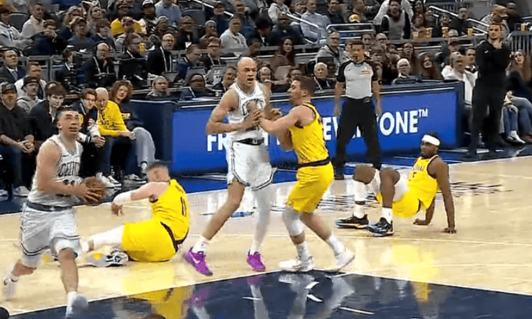 比赛的第三节,TJ-麦康奈尔与乔丹-沃尔什拼抢中相互推搡,爆发冲突双双吃T。