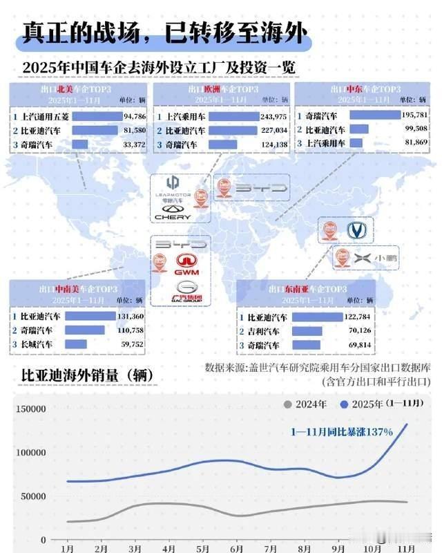 比亚迪牛!牛!牛! 460万辆目标稳了!引爆海外市场。 2025年比亚迪在车市真的杀疯了,年度460万辆的阶段目标基本稳了!1-11月累计已经卖了418.2万辆,12月只要再卖41.8万辆就达标,而11月单月就卖了48.02万辆,创下今年新高,照这势头12月冲50万辆都有可能。 旗下方程豹品牌更是黑马,11月直接卖了3.74万辆,同比暴涨339%,都冲进新势力销量前四了。尤其是钛7这款车,11月单月卖了2.4万辆,上市80天累计销量超5万辆,直接成了混动SUV和方盒子车型的双料冠军,连原本考虑理想L6的买家都被吸引过来了。 最让人惊喜的还是海外市场,简直是爆发式增长!11月单月出口就突破13万辆,同比增长超3倍,1-11月累计出口91.68万辆,全年冲百万辆完全没压力。现在比亚迪在近200个国家和地区都有布局,在巴西、意大利、西班牙等11个国家的新能源销量都超过了特斯拉,新加坡更是拿下全品牌销冠。 能卖这么好,本地化生产功不可没。巴西工厂已经投产,匈牙利工厂2026年也会正式上线,再加上自有滚装船保障运输,供应链稳得很。而且比亚迪累计研发投入超2200亿元,技术硬、定价又实在,才造出了这么多爆款。从0到1470万辆新能源汽车,比亚迪用了17年,而从1000万到1470万仅用13个月。