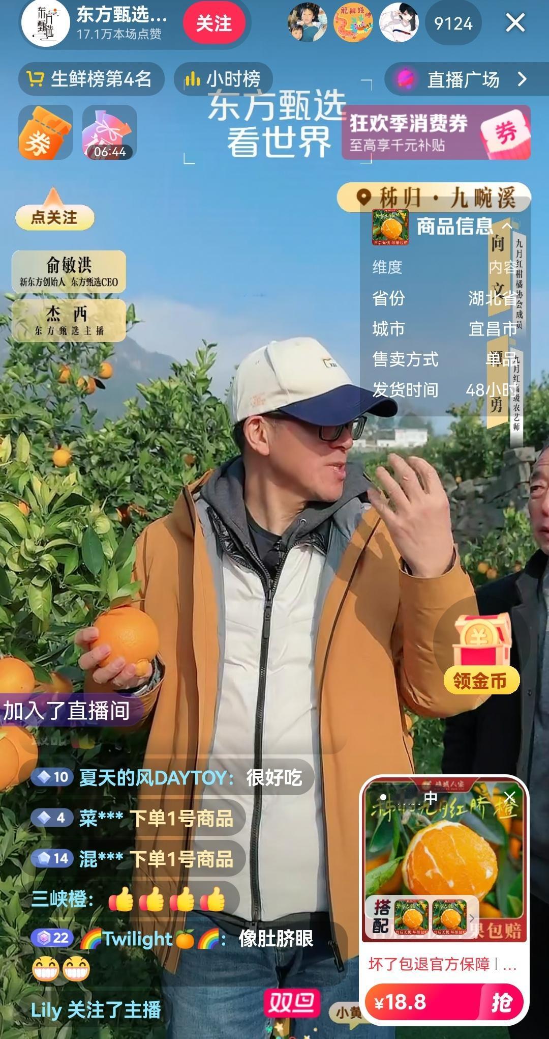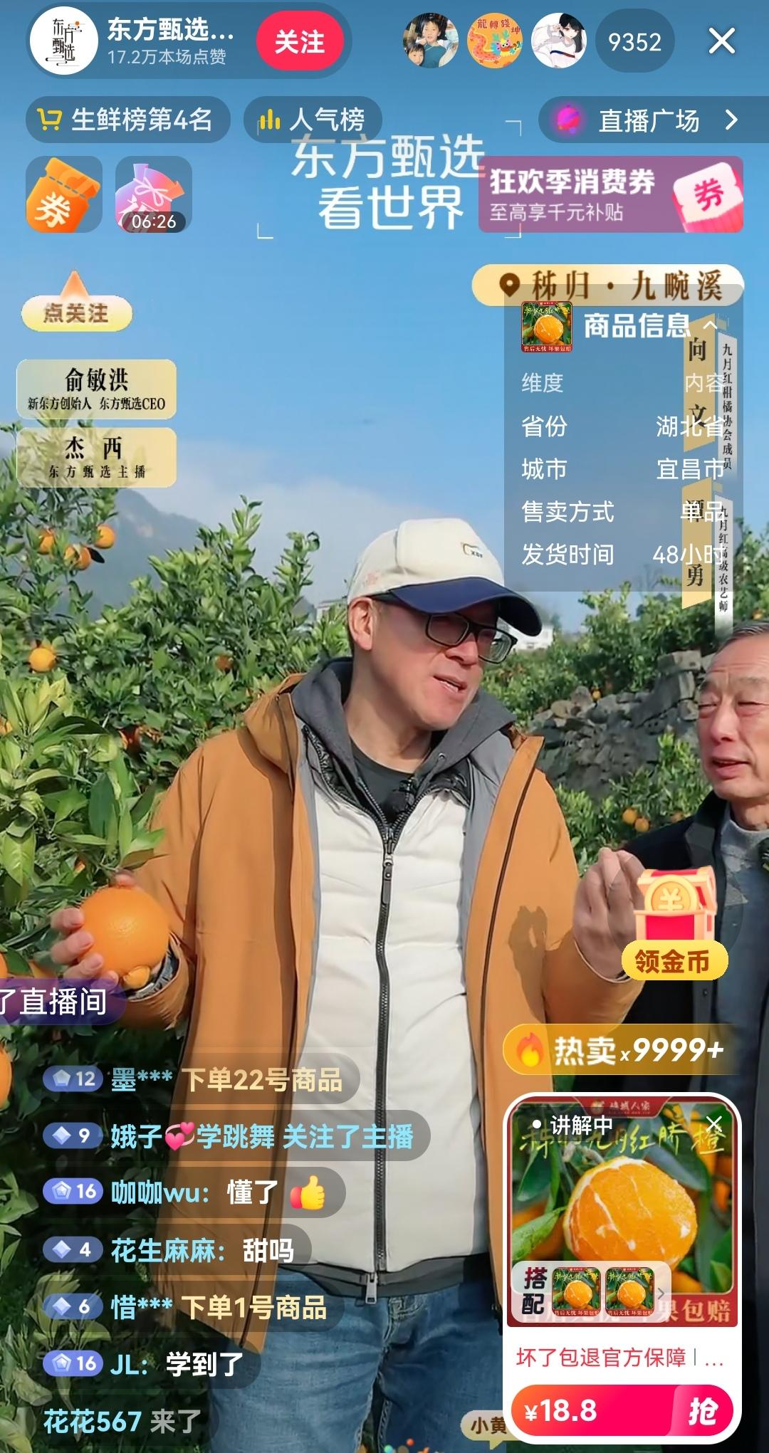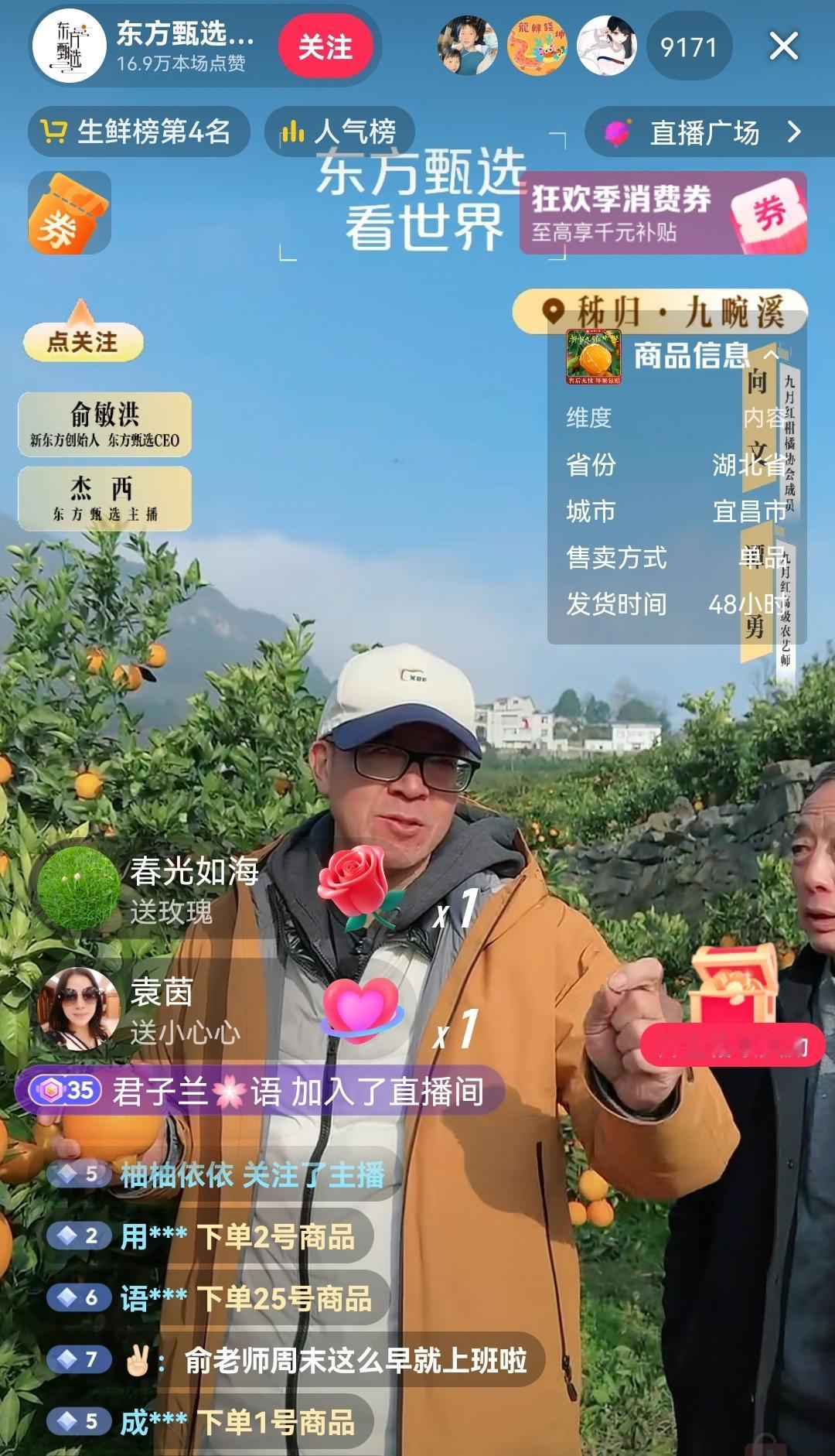 12月27日,俞老师和杰西去了秭归,这次来秭归是帮助农户销售当地的农产品脐橙。 俞老师这次到秭归是冬礼寒冷的时候,所以穿的很厚,依然穿着喜欢的牛仔裤,白色保暖衣和橘红色挡风外套,戴着白色帽子,和当地专家一起到脐橙种植地里给大家讲解秭归的脐橙种植发展知识。 俞老师和杰西直播的时候,让当地的两位专家坐在中间,他坐在一旁帮忙宣传。