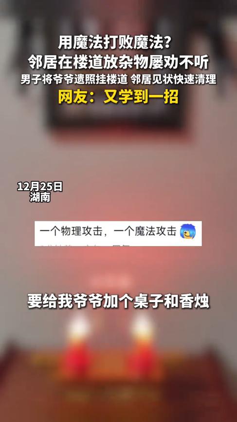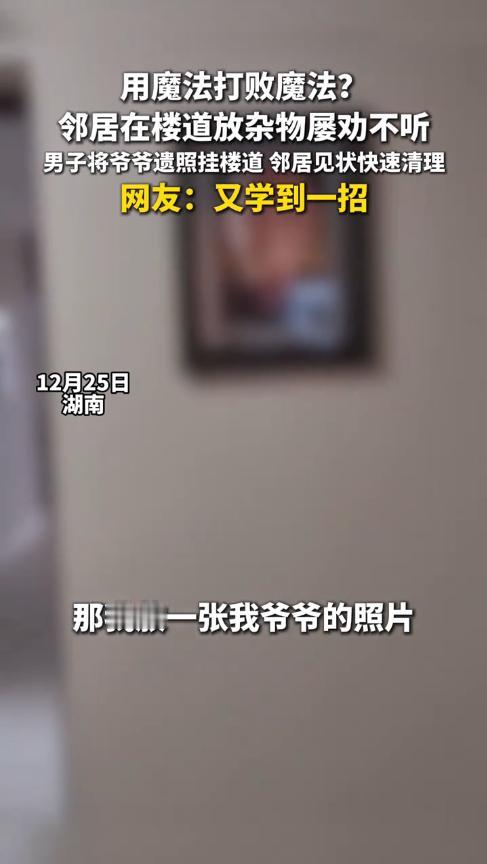 “中国人都看不下去了!”近日,湖南,一男子多次劝邻居,不要把臭鞋放在楼道公共区域,也联系了物业上门劝阻,可是邻居就是不改!没有办法,男子便把爷爷的遗像挂在了门口,邻居很快就主动搬走了鞋柜。网友:还是爷爷面子大! 都说远亲不如近邻,一个好的邻里关系,确实让人非常轻松,可如果邻居的人品不行,那么就要忍受长期的煎熬,遇到这种邻居,你会怎么办呢? 据媒体12月26日的报道,男子邻居家在楼道的公共区域内,摆放了一个鞋柜,上面是各种鞋子,不仅如此,还在门口堆放了大量的杂物,严重影响其他住户的通行。 男子每次出门都要捏着鼻子,最终实在忍不了了,就找邻居商量,让他把楼道清理干净,不要这么自私,可是邻居却觉得没碍到别人的事,坚决不搬。 之后男子还喊来物业的人上门劝阻,可是邻居只是嘴上答应,并没有付出实际行动。 各种办法都用了,男子见对方就是不知悔改,于是直接搬出了爷爷的遗像挂在墙上,随后又买来桌子、摆上香炉,这回邻居一出门也能看到。 没想到,邻居很快就主动打扫干净了楼道,再也没有放过东西。 网友看后表示,这种人就不能和他讲道理,必须以其人之道还治其身!别人摆东西他觉得难受了,为什么自己摆的东西就不在乎别人的感受? 信息来源:《遇到沟通无效的楼道堆物你会怎么做?》新湖南